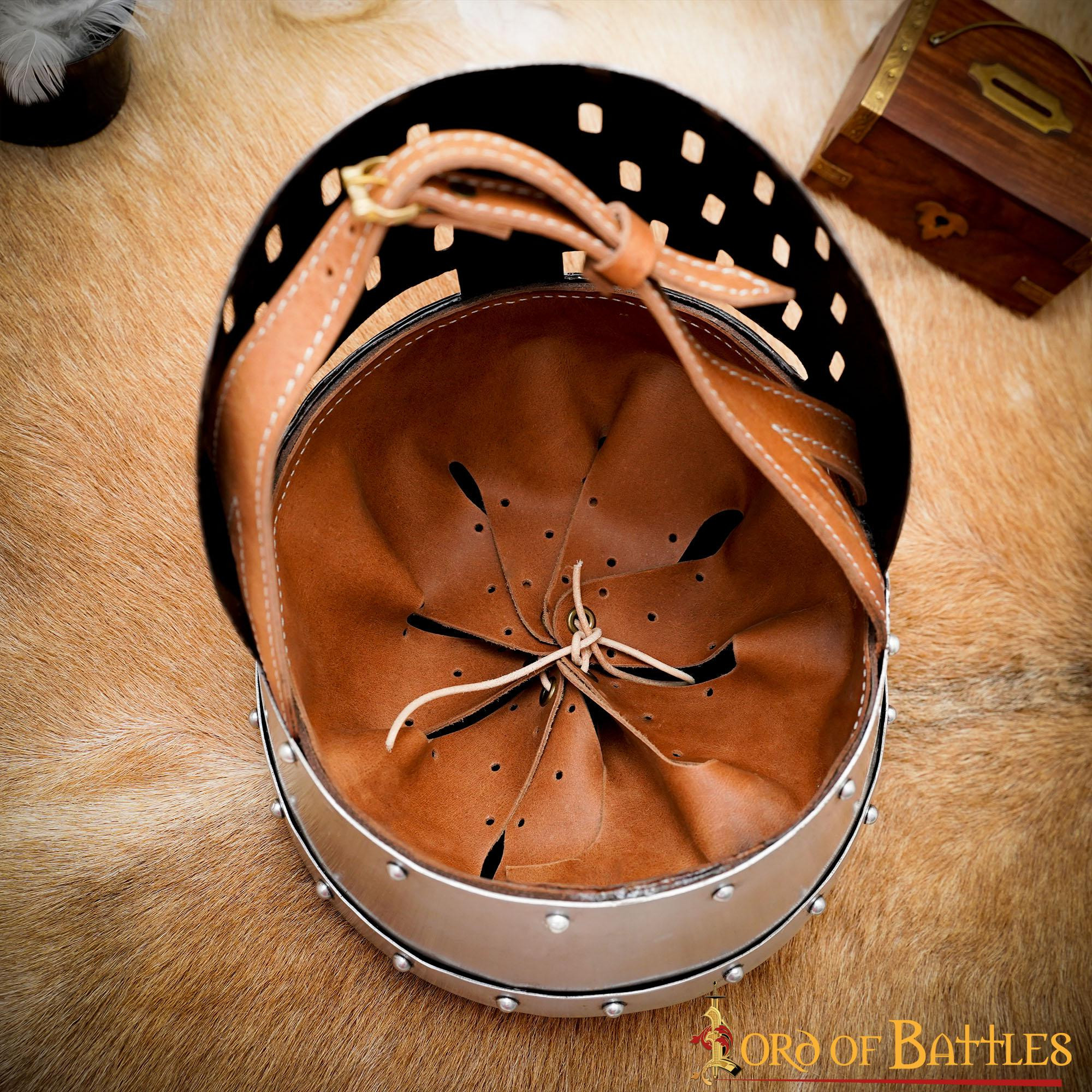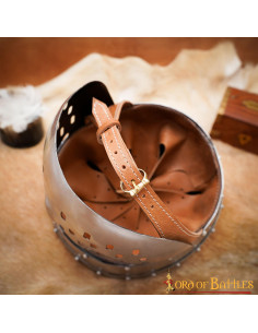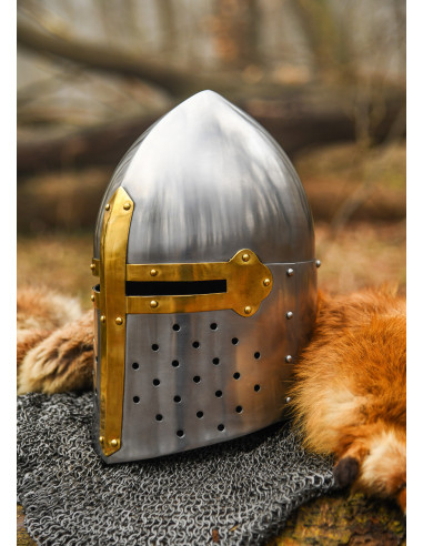 Der Kreuzritterhelm S. XII-XIII ist ein authentisches Kunstwerk, das von den Modellen des XII.-XIII. Jahrhunderts inspiriert ist. Jedes Detail dieses Helms wurde sorgfältig handgefertigt aus robustem Weichstahl der Stärke 16, um Haltbarkeit und Authentizität zu gewährleisten.