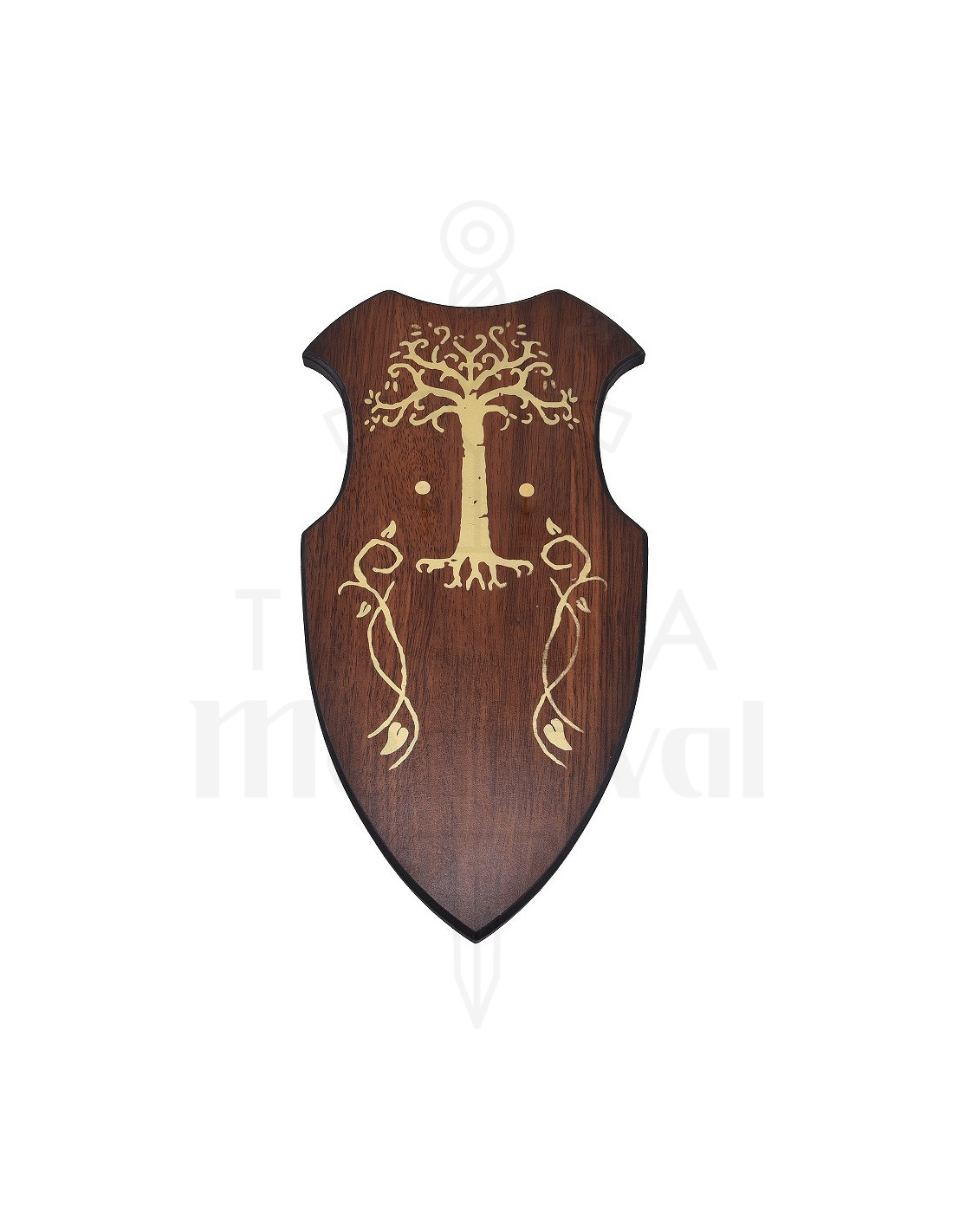 Dieses Stück kombiniert die Wärme von Holz mit einem dunklen und polierten Finish, das jede Umgebung aufwertet, während die längliche Silhouette und die geschwungenen Kanten Präsenz zeigen, ohne zu viel Platz zu beanspruchen. Das dekorative Paneel mit einem goldenen Design, das einen Baum mit sichtbaren Wurzeln und seitlichen Ranken zeigt, bietet einen eleganten Blickfang, der darauf ausgelegt ist, den Griff Ihres Schwertes zu ergänzen und der Präsentation visuelle Tiefe zu verleihen.