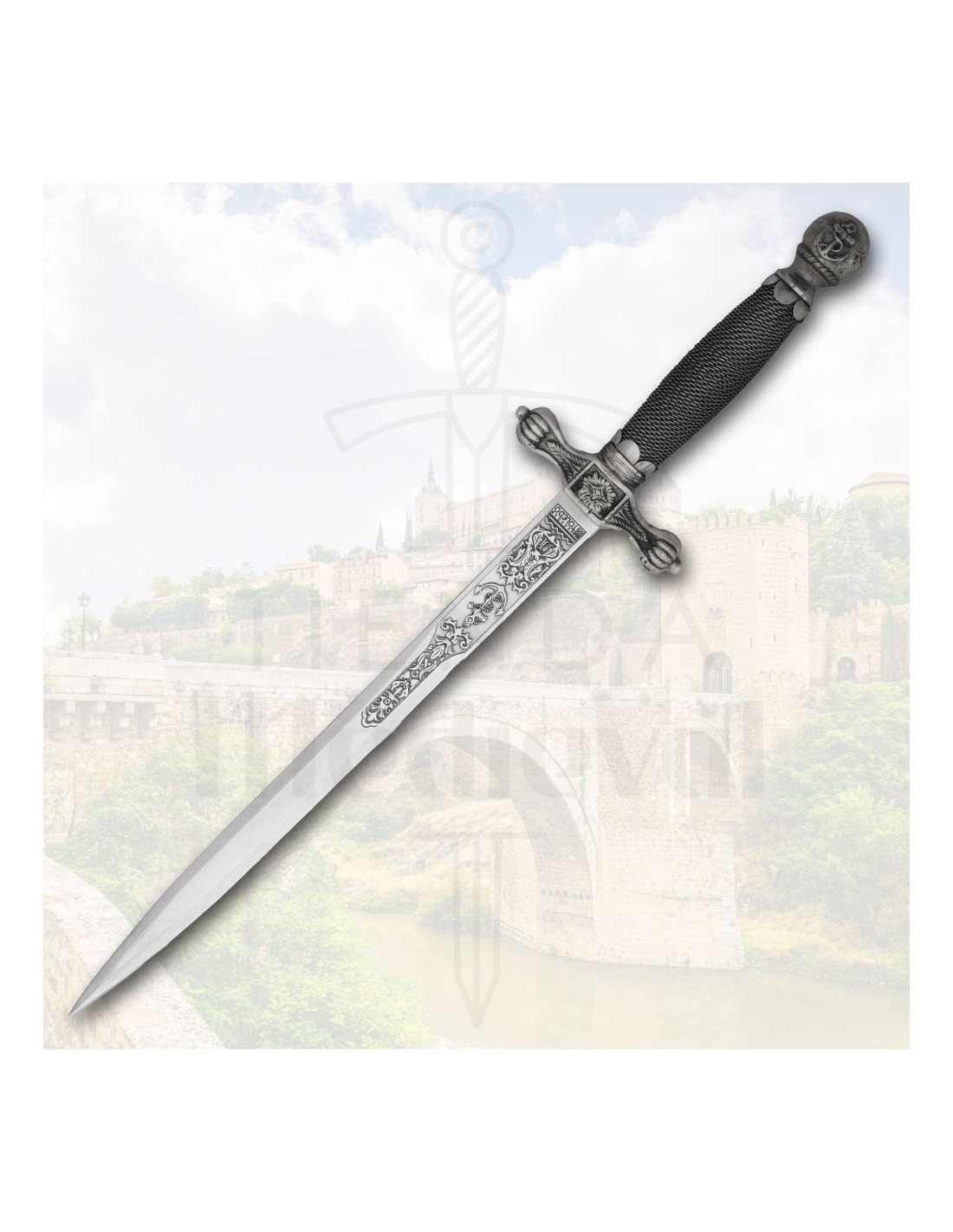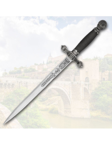 Entdecke ein einzigartiges Stück, das nicht nur deinen Raum verschönern wird, sondern auch eine reiche Geschichte erzählt! Diese dekorative Daga, inspiriert vom emblematischen maritimen Design, ist eine wahre Hommage an die handwerkliche Meisterschaft von Toledo, Spanien. Jeder Blick auf dieses Werk versetzt dich in die Zeiten von Rittern und epischen Abenteuern.