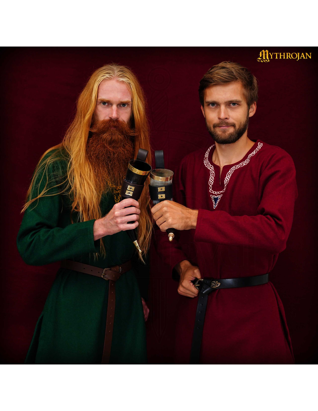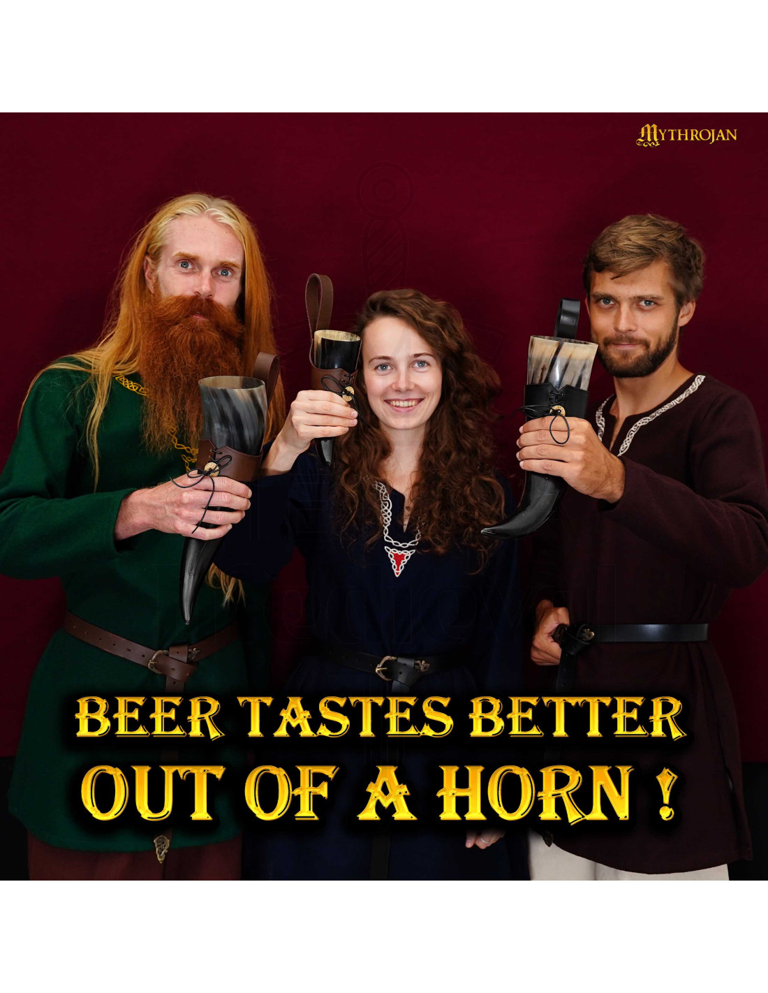 Entdecken Sie das authentische Wikinger-Trinkhorn 350 ml Modell Merchant und machen Sie jede Veranstaltung zu einem legendären Erlebnis! Mit einem idealen Fassungsvermögen von 350 ml eignet sich dieses Horn perfekt zum Mitnehmen bei Ihren Veranstaltungen, ohne auf Volumen zu verzichten. Stellen Sie sich vor, Sie trinken ein Bier oder Met bei einem mittelalterlichen Bankett, dieses Horn wird Sie bei jedem Trinkspruch begleiten!