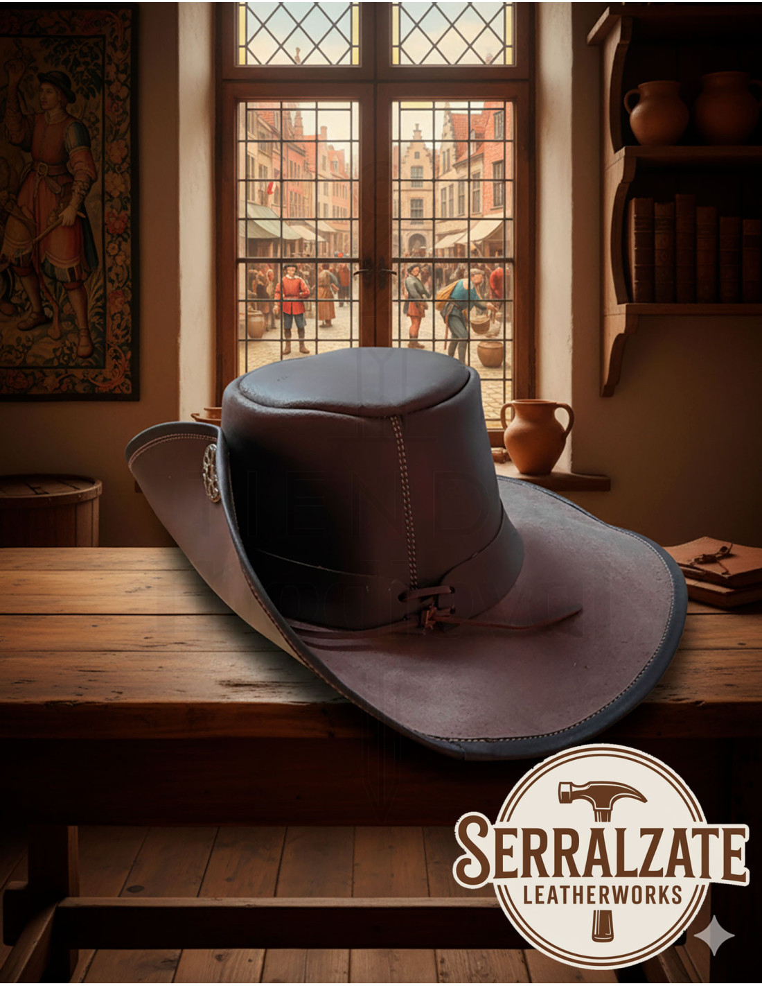 Sorgfältig in Spanien gefertigt, garantiert der Flandres-Hut Langlebigkeit und eine überlegene Qualität, die ihn hervorhebt. Das weiche Leder sorgt für außergewöhnlichen Komfort und passt sich angenehm und leicht an. Tragen Sie diesen Hut, um jedem mittelalterlichen oder historischen Outfit eine elegante und mutige Note zu verleihen.