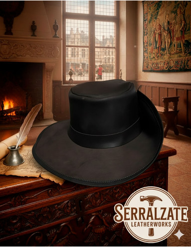 Der mittelalterliche Lederschmuckhut im Flandrischen Stil in Schwarz ist ein spanisches Handwerksstück, das sowohl durch sein robustes Design als auch durch seinen klassischen Stil besticht. Gefertigt aus hochwertigem Leder ist dieser Hut perfekt für alle, die ein Accessoire suchen, das die Essenz von Musketieren, Piraten und Abenteurern evoziert und jedem historischen oder Fantasie-Outfit Authentizität verleiht. Sein breiter Rand, verziert mit einer verschmolzenen Münze, die den Rand sichert, ist ein markantes Detail, das seinen eleganten Charakter unterstreicht.