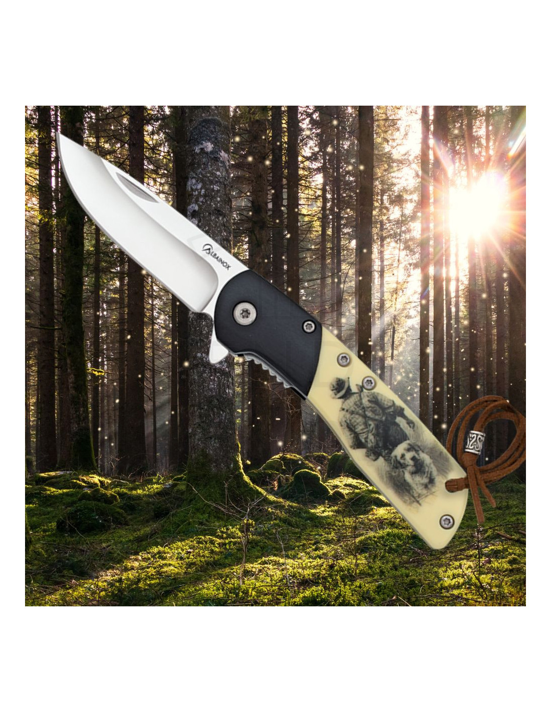 Mit einer Klinge aus 3CR13MOV-Stahl gewährleistet es einen präzisen Schnitt und langfristige Widerstandsfähigkeit. Die satinierte Oberfläche verleiht ihm ein raffiniertes und professionelles Aussehen. Darüber hinaus kombiniert der Griff schwarzes Holz und ABS und bietet einen festen, bequemen und eleganten Halt. Er enthält eine exklusive Gravur eines Jägers mit seinem Hund im Griff, ein Detail, das nicht nur seine Ästhetik hervorhebt, sondern ihm auch einen einzigartigen Charakter verleiht.