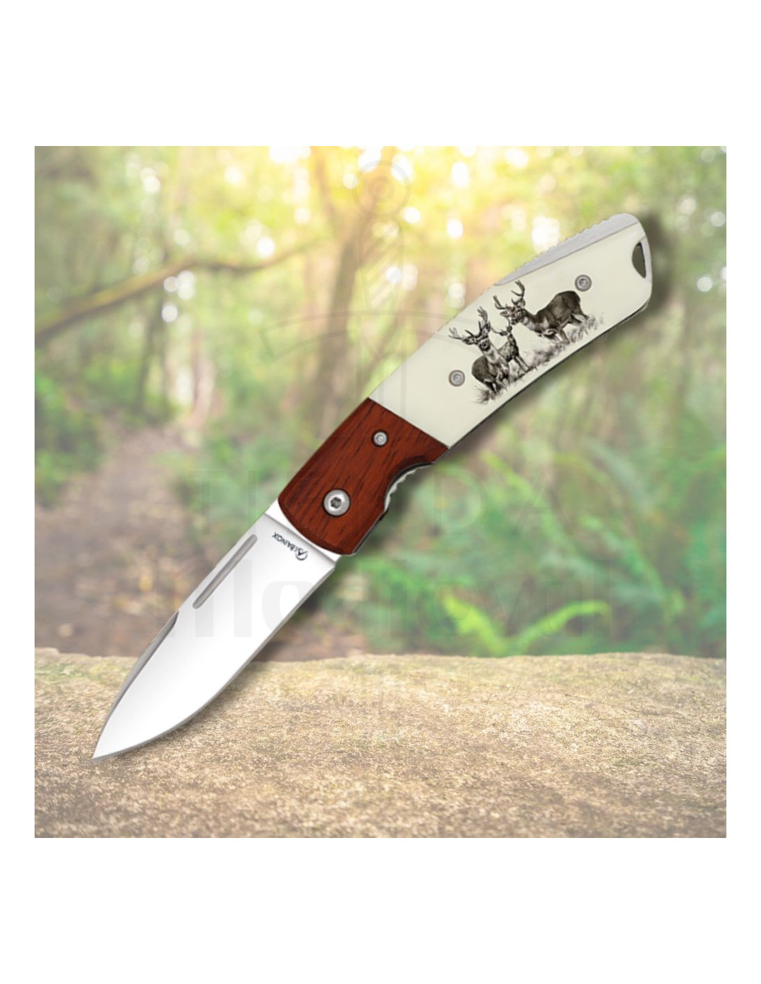 Der Griff ist ein Kunstwerk für sich, das warme und natürliche Töne mit einem Hauch von Raffinesse verbindet, dank der Gravur zweier majestätischer Hirsche. Diese Verzierung bringt nicht nur Schönheit, sondern spiegelt auch die Verbindung zur wilden Umgebung wider und ruft den Geist des Jägers und Naturfreundes hervor.