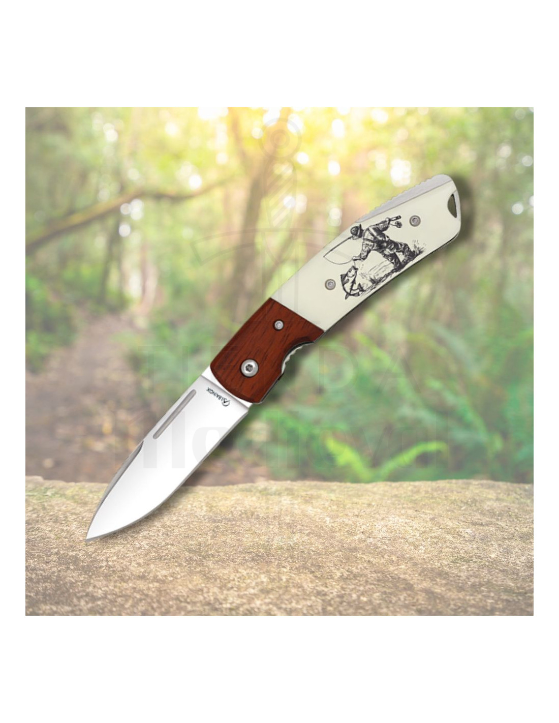 Der Griff, aus ABS gefertigt, sorgt für einen bequemen und robusten Halt. Er ist mit einer roten Virola versehen, die einen markanten Akzent setzt und die Sicherheit bei der Handhabung erhöht. Das elegante eingravierte Motiv eines angreifenden Mannes mit Fisch verleiht dem Messer eine einzigartige und persönliche Note und macht es zu mehr als nur einem Werkzeug – zu einem Symbol für Leidenschaft für Natur und Sport.