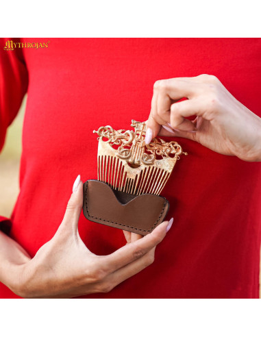 Die handgenähte Ledertasche schützt nicht nur das Stück, sondern macht es auch einfach zu transportieren und auszustellen – ideal, wenn du einen Wikingerkamm aus Bronze mit Lederhülle, gealtertes Finish als Geschenk oder als Detail für deine historischen Outfits kaufen möchtest. Der obere Verschluss hält die Verzierung sicher, verleiht Sicherheit und einen mechanischen Touch, der auf eine sorgfältige Herstellung hinweist.
