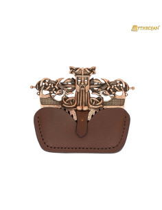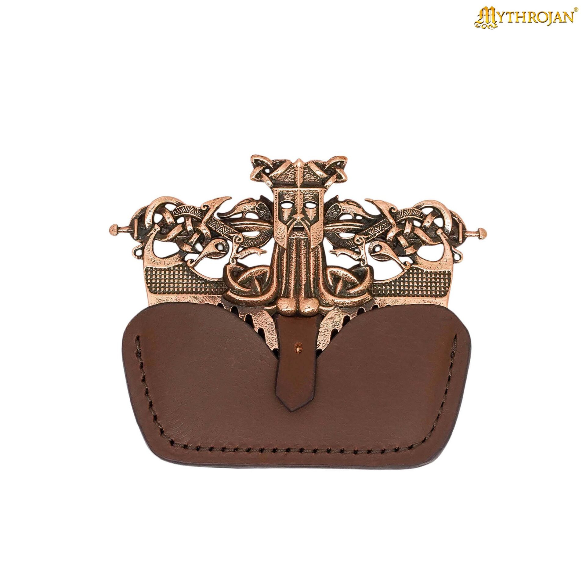 Dieses Accessoire verbindet Nützlichkeit und Präsenz, gedacht für diejenigen, die sowohl Stil als auch Authentizität schätzen. Das Design mit verflochtenen Knoten und die zentrale Figur mit Bart und Helm rufen die künstlerische Fähigkeit der nordischen Handwerker hervor, während die zoomorphen Formen den kriegerischen Charakter verleihen, der ein Stück ausmacht, das man am Gürtel oder in der Tasche trägt. Die metallische Textur und das gealterte Finish vermitteln Wärme und Persönlichkeit, sodass du es täglich verwenden kannst, ohne seine historische Aura zu verlieren.