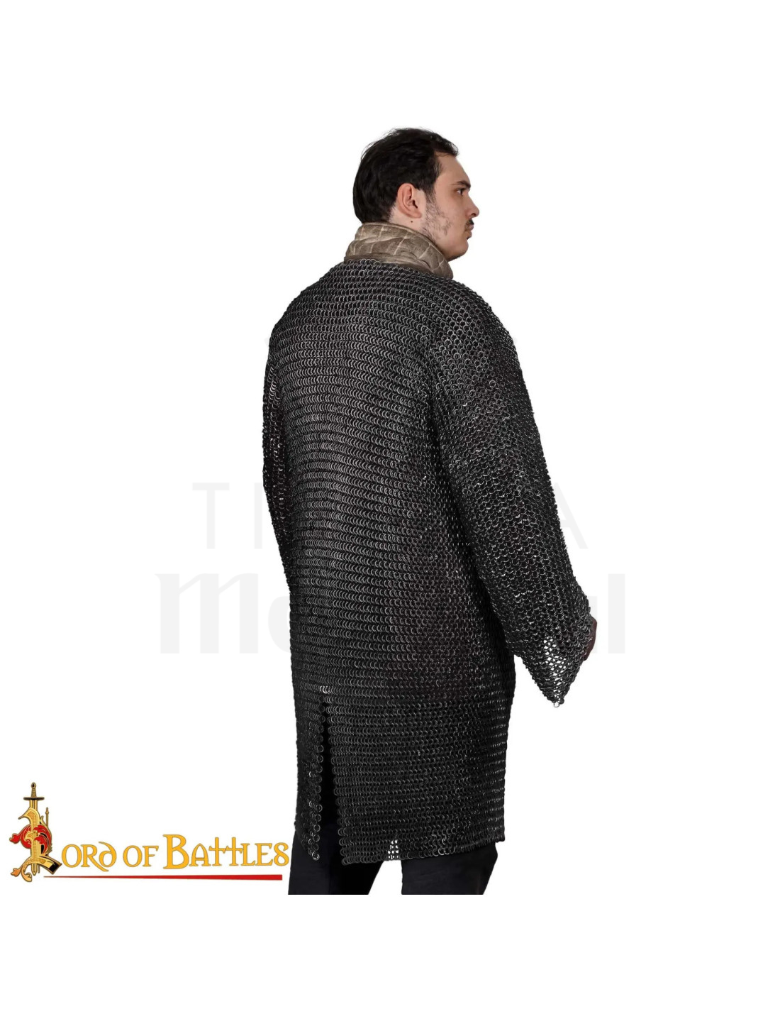 Vernietetes, geschwärztes Kettenhemd mit rundem Ring. Robuste 18-Gauge-RUNDRINGE aus geschwärztem Flussstahl (ca. 9 mm Durchmesser) mit abwechselnd flachen Ringen werden von unseren erfahrenen Handwerkern sorgfältig gewölbt vernietet. Das aufwendig ineinandergreifende Muster im FOUR IN ONE-Muster sorgt für Schutz vor überraschenden Angriffen.