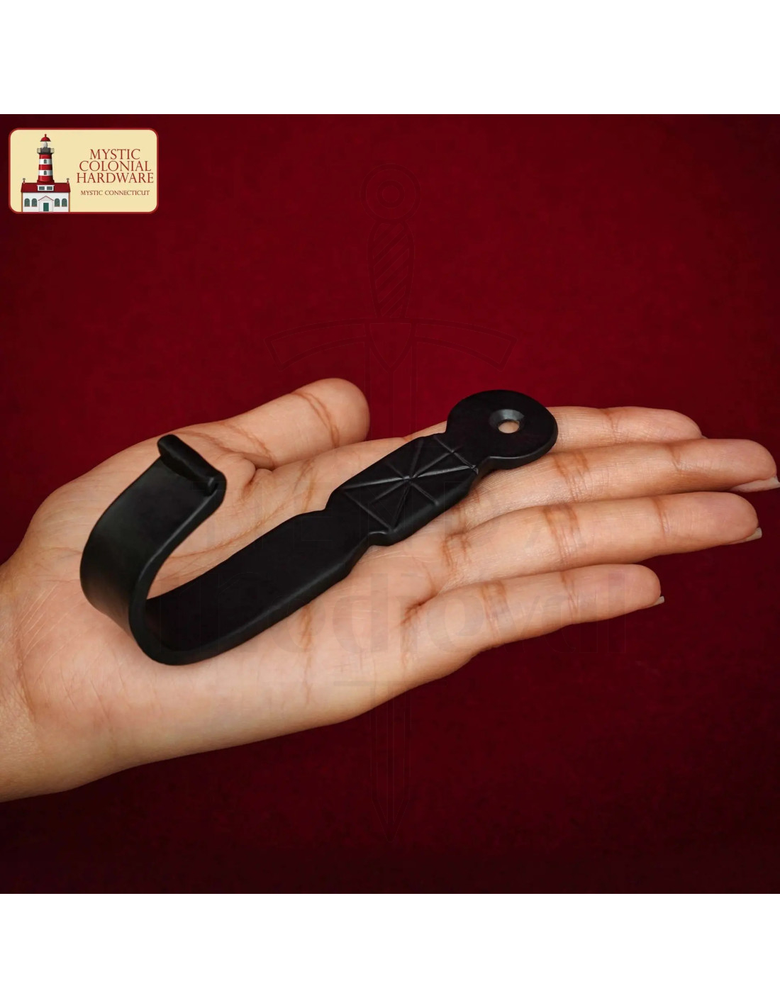 Vielseitig einsetzbar, eignet sich dieser Haken perfekt zum Aufhängen von Mänteln, Taschen, Schlüsseln, Hüten und Bademänteln. Das schwarze Design passt sowohl zu rustikalen als auch zu modernen Interieurs, die einen industriellen Kontrast suchen. Der Holzgrund im Bild dient nur als visuelle Unterstützung; die Hauptrolle spielt das Metall und seine handwerkliche Verarbeitung.