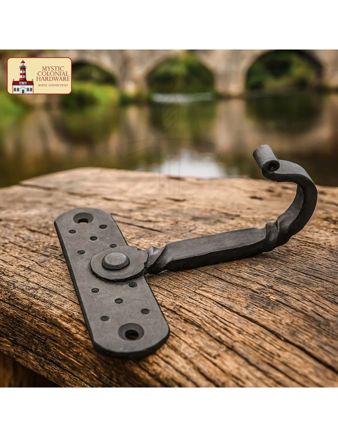 Das Stück wird von erfahrenen Schmieden gefertigt, mit gehämmerter Textur und einem dunklen Finish, das Charakter mühelos verleiht. Die rechteckige Platte mit abgerundeten Kanten und Schraubenlöchern ermöglicht eine saubere Montage, während der gebogene Arm, der in eine kleine Rolle endet, dank seiner Drehachse eine sanfte Bewegung bietet, was den täglichen Gebrauch komfortabler macht und plötzliche Abnutzungen vermeidet.