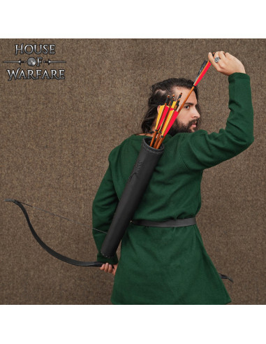 Mit einer ungefähren Höhe von 60 cm verjüngt sich dieser Schutz von 9,7 cm an der Oberseite auf 6,5 cm an der Basis, was eine schnelle Auswahl und das Schießen der senkrecht platzierten Pfeile ermöglicht. Dank seiner handgenähten Lederverarbeitung bietet er das perfekte Gleichgewicht zwischen Leichtigkeit und Robustheit, was den Transport auf dem Rücken oder seitlich durch den verstärkten Doppelriemen erleichtert, der für lange Schießtage oder historische Veranstaltungen ausgelegt ist.