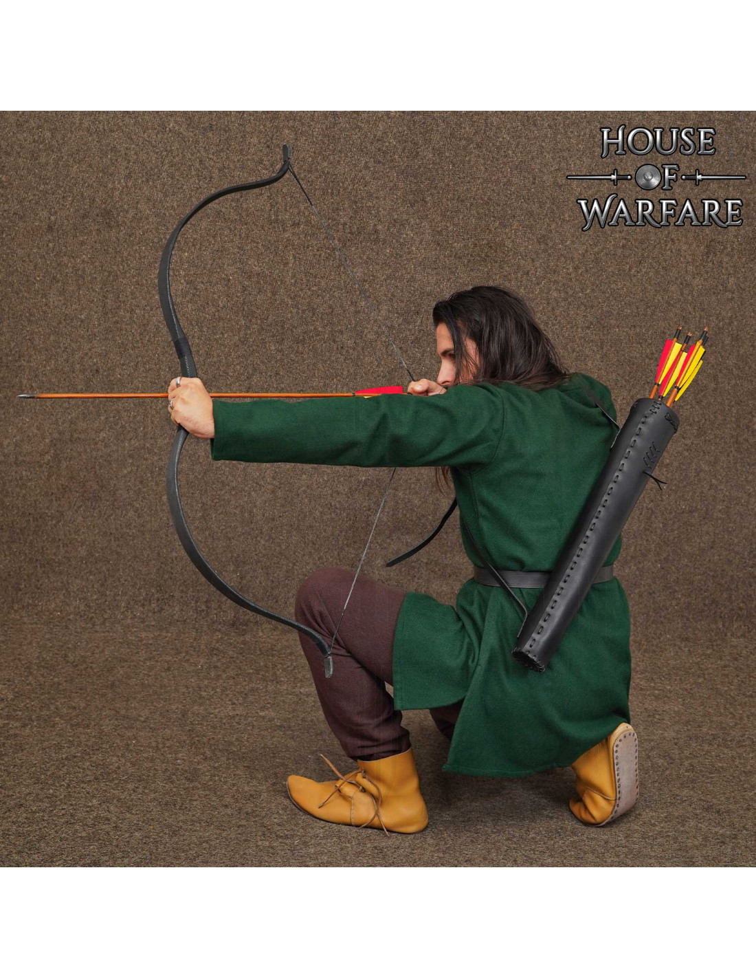 Sein breiter, aufgerollter Rand sorgt dafür, dass die Öffnung mit der Zeit offen bleibt, was das Laden und Entladen ohne Probleme erleichtert. Zudem spiegeln handwerkliche Details wie sichtbare Nähte und dekoratives Flechtwerk an der Oberseite eine zarte und langlebige Arbeit wider, die bei Gebrauch Bestand hat. Ideal für das Üben mit Lang- oder Reiterbogen, die Teilnahme an mittelalterlichen Events oder als Sammlerstück zur Ausstellung zuhause.