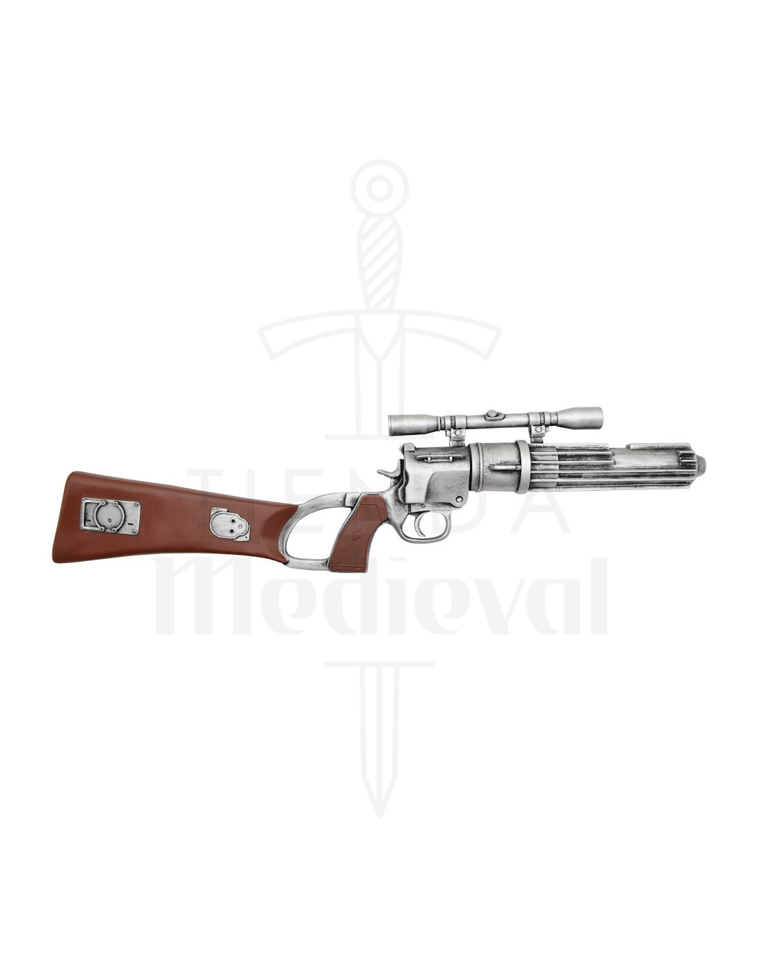 Dieses Gewehr kombiniert die klassische Ästhetik eines Revolvers mit futuristischen Akzenten und bietet eine einzigartige Präsenz: Der silberne Korpus mit Zylinder und der lange, genutete Lauf verleihen dem Stück eine technische und detaillierte Ausstrahlung, während das Zielfernrohr und die konturierte Silhouette ein Gefühl von filmischer Authentizität erzeugen. Der hochwertige Harzlack sorgt für scharfe Details, damit jede Textur und jede Metallplatte auf den ersten Blick ins Auge fallen.
