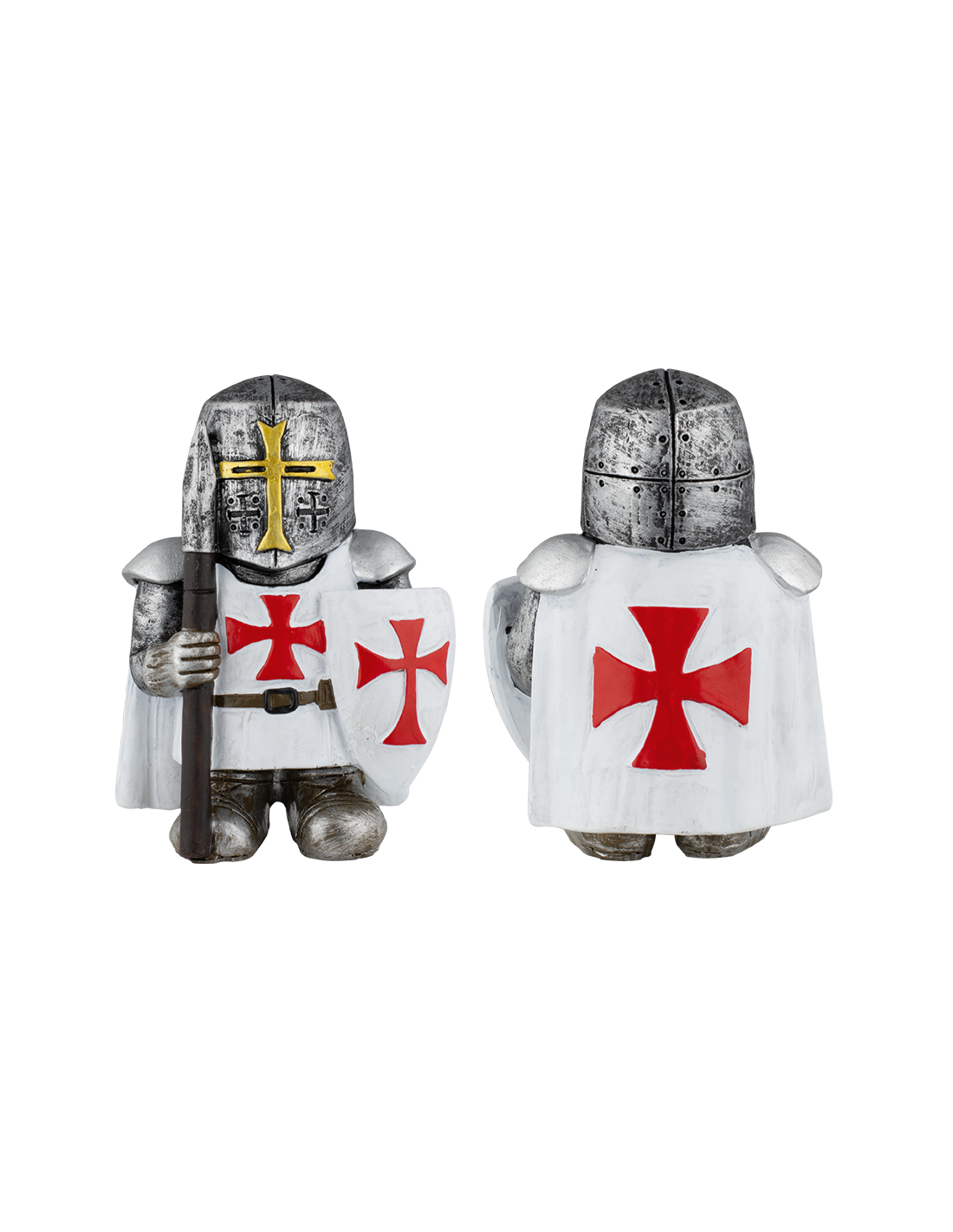 - Einzelheiten: Der Templerritter ist prächtig dargestellt und trägt einen Wappenrock und einen Umhang mit dem Templerkreuz, einem markanten Emblem des Tempelritterordens. Sein runder Helm ist grau mit einem goldenen Kreuz vorne, was der Figur Authentizität und Realismus verleiht. Darüber hinaus hält er in einer Hand einen Speer, was seine Kriegernatur und seine Rolle bei den Kreuzzügen widerspiegelt.