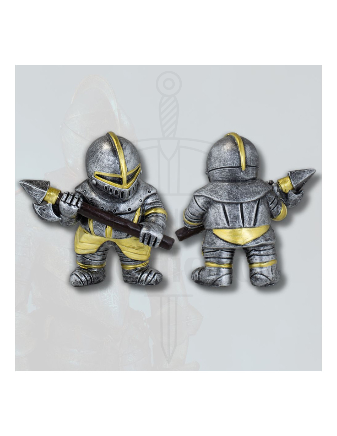 Der Krieger ist mit einer Rüstung in Silber- und Goldtönen ausgestattet, die durch ihr Detailniveau und die Ausführung, die an gealtertes Metall erinnert, hervorstechen. Seine Lanze, mit großer Sorgfalt gefertigt, verstärkt das Gefühl von Realismus dank ihres dunklen Griffs und der elaborierten Spitze. Die Hosen in Gelbtönen sorgen für einen interessanten visuellen Kontrast, während der Helm den Kopf mit funktionalen und ornamentalen Details bedeckt.