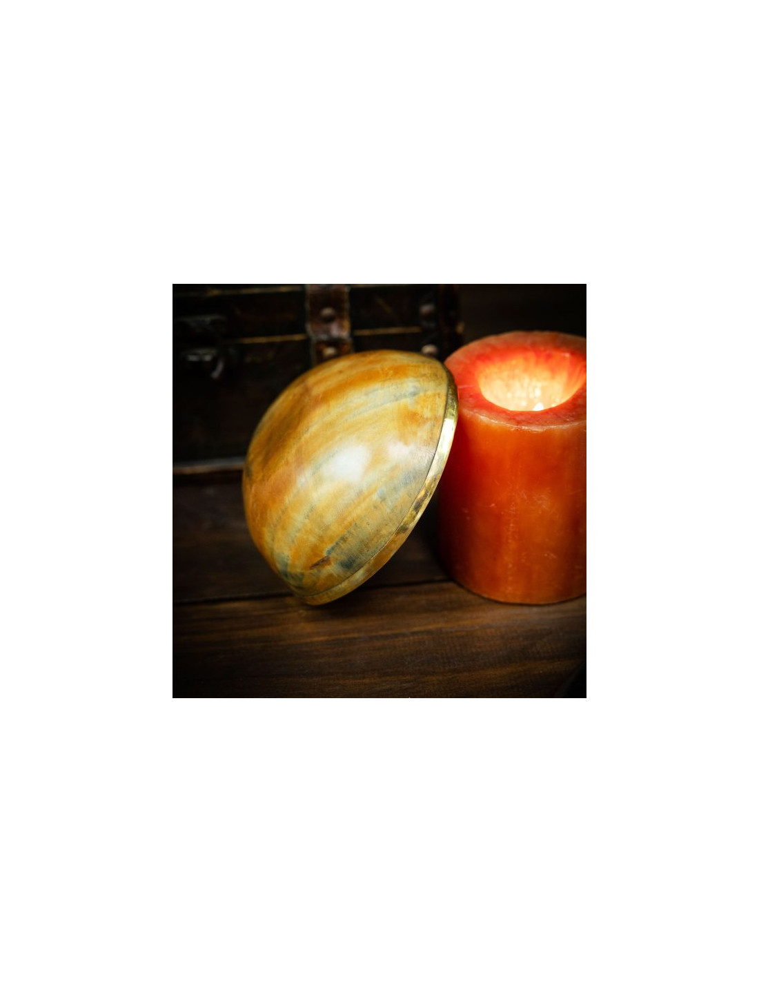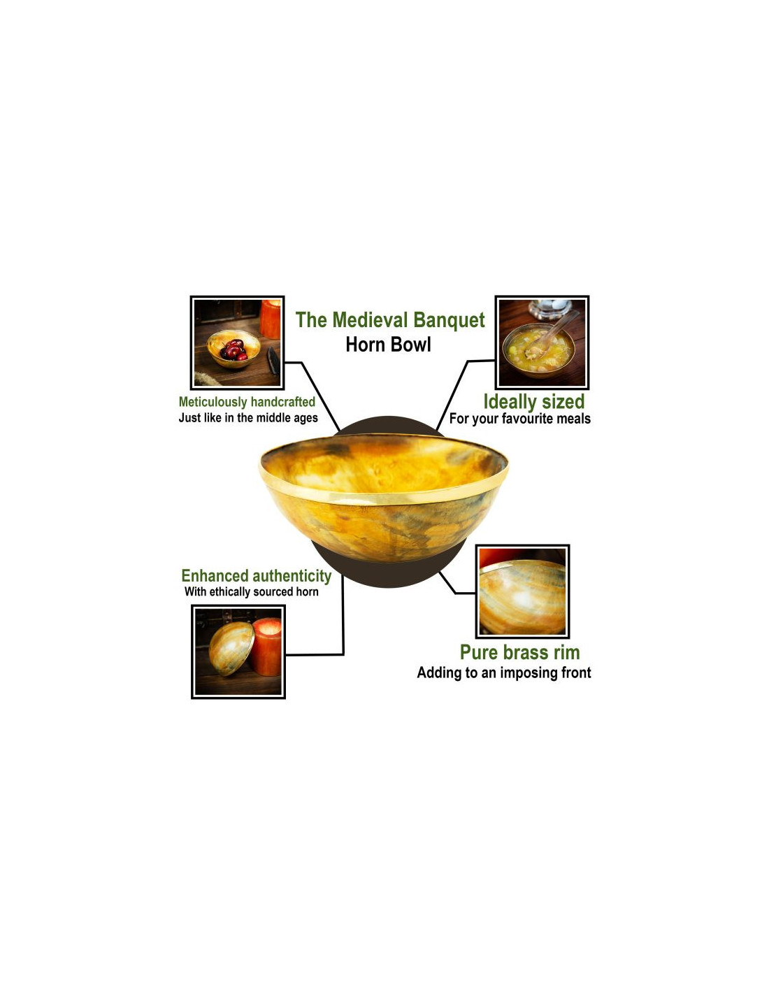 Um den mittelalterlichen Charakter hervorzuheben, wurde der Rand dieser Schale mit einem massiven Messingrand versehen, der dem Design eine unverwechselbare Note verleiht. Mit einem Durchmesser von ca. 12,7 cm und einem Fassungsvermögen von ca. 300 ml ist diese Schüssel geräumig genug, um Ihre Lieblingsgetränke während eines Wikingerfests zu servieren.