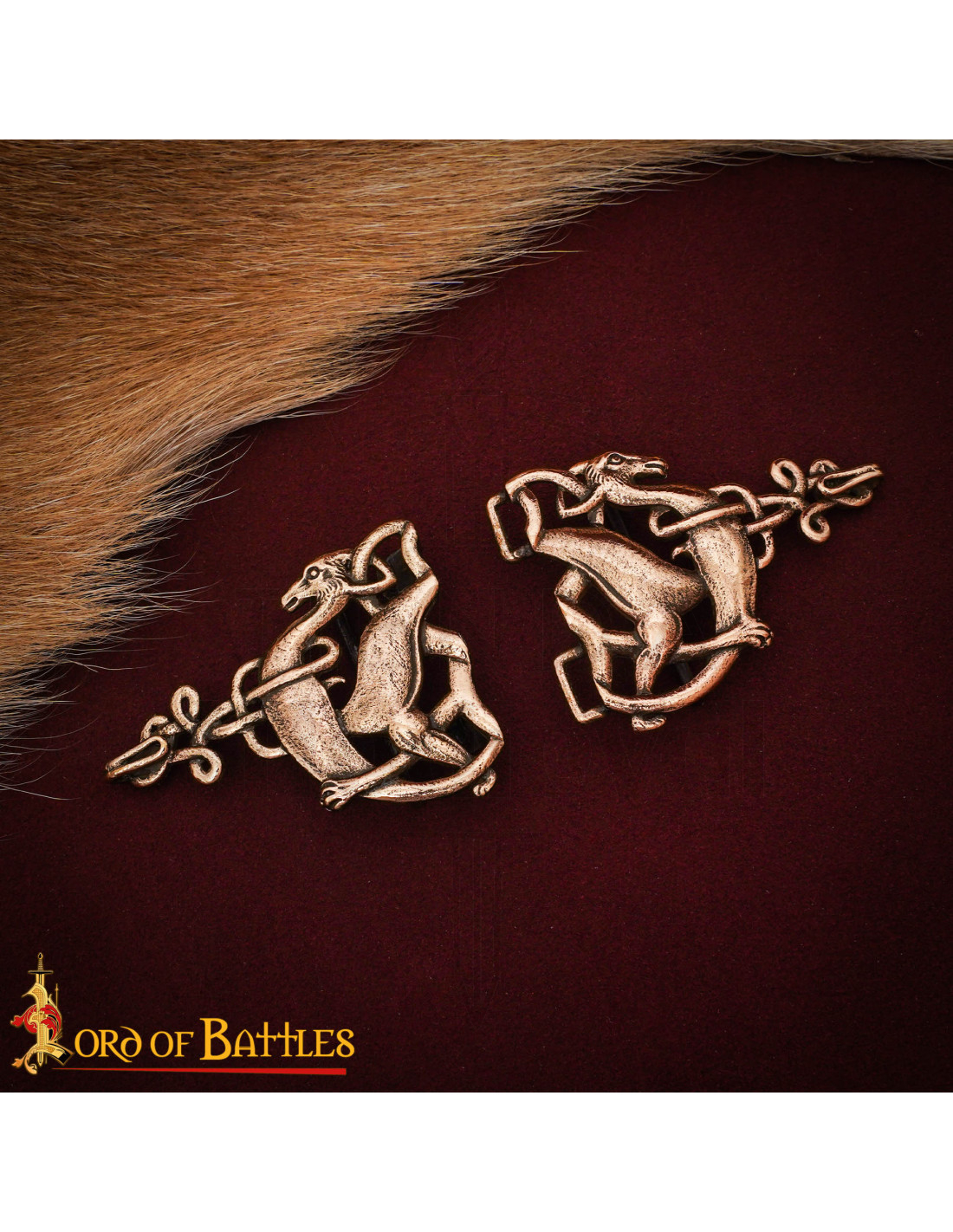 Mit einem keltischen Motiv von verflochtenen Rehen vermitteln die gegenüberstehenden Figuren und das kunstvoll gewebte Knotenmuster Bewegung und Eleganz, während die Linien, die Textur simulierend, an die Haut und das gestylte Fell antiker mittelalterlicher Stücke erinnern. In der Fotografie intensiviert der matte Glanz des Bronzes auf einem burgunderfarbenen Stoff seine Präsenz und lässt es sogar in schlichten Szenen hervorstechen.
