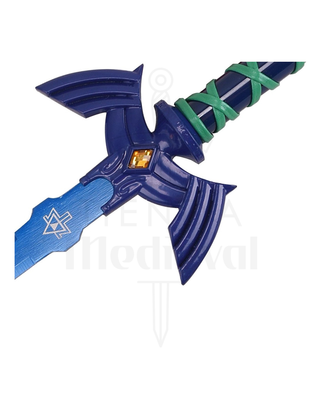 Die einheitliche blaue Klinge mit einem eingravierten Symbol in der Mitte zieht sofort die Aufmerksamkeit auf sich und verleiht denjenigen, die in Sammlungen hervorstechen wollen, den gewünschten besonderen Touch. Die eckige und symmetrische Form des Pommel, gekrönt von einem bernsteinfarbenen Edelstein, verleiht Präsenz und Eleganz und schafft einen Kontrast, der jeden Raum, in dem Sie sie platzieren, aufwertet.