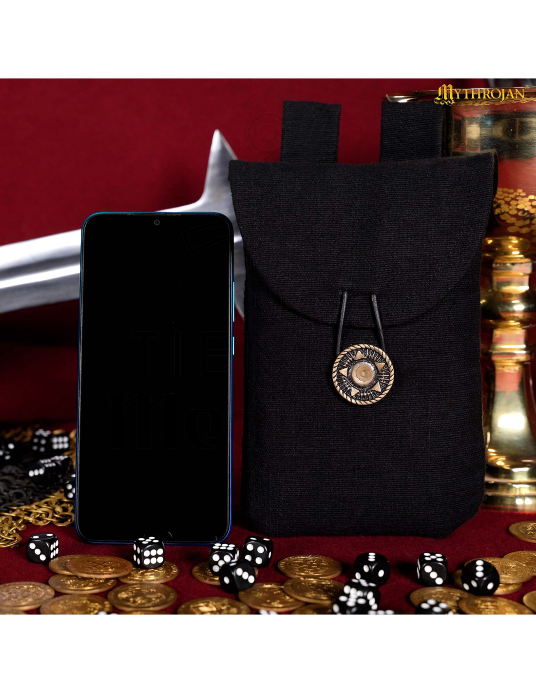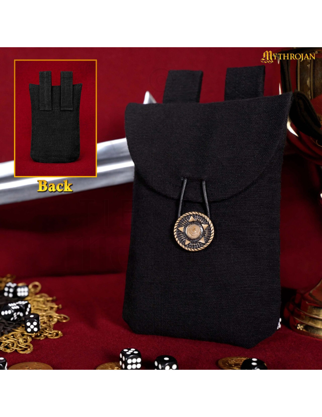 Ihre kompakte Größe und die Kompatibilität mit Gürteln bis zu 8 cm Breite erleichtern die Nutzung und den Transport, während sie Ihrem Outfit einen Hauch von Authentizität verleihen. Das schwarze Erscheinungsbild und die dekorativen Details in Messing, ergänzt durch funktionale Träger auf der Rückseite, machen diese Tasche zu einem vielseitigen Stück, das Nutzen und mittelalterlichen Stil vereint.