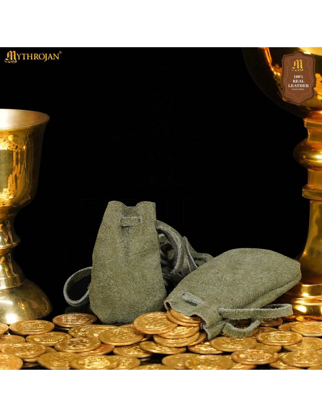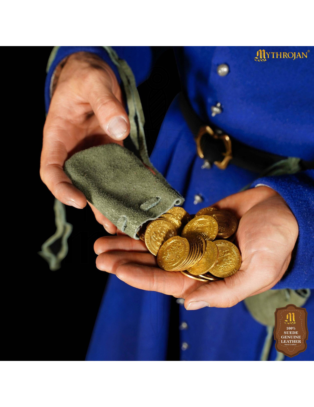 Verleihen Sie Ihrer mittelalterlichen Welt einen authentischen Touch mit diesen eleganten Limosner-Taschen aus Wildleder in lebendigem Grün. Perfekt zum Aufbewahren von Münzen, Würfeln, Kräutern oder kleinen Gegenständen, machen ihr weiches Finish und ihr klassisches Design sie ideal, um jedes LARP-, SCA-, Renaissance-Markt- oder Wikinger-Thema zu vervollständigen.