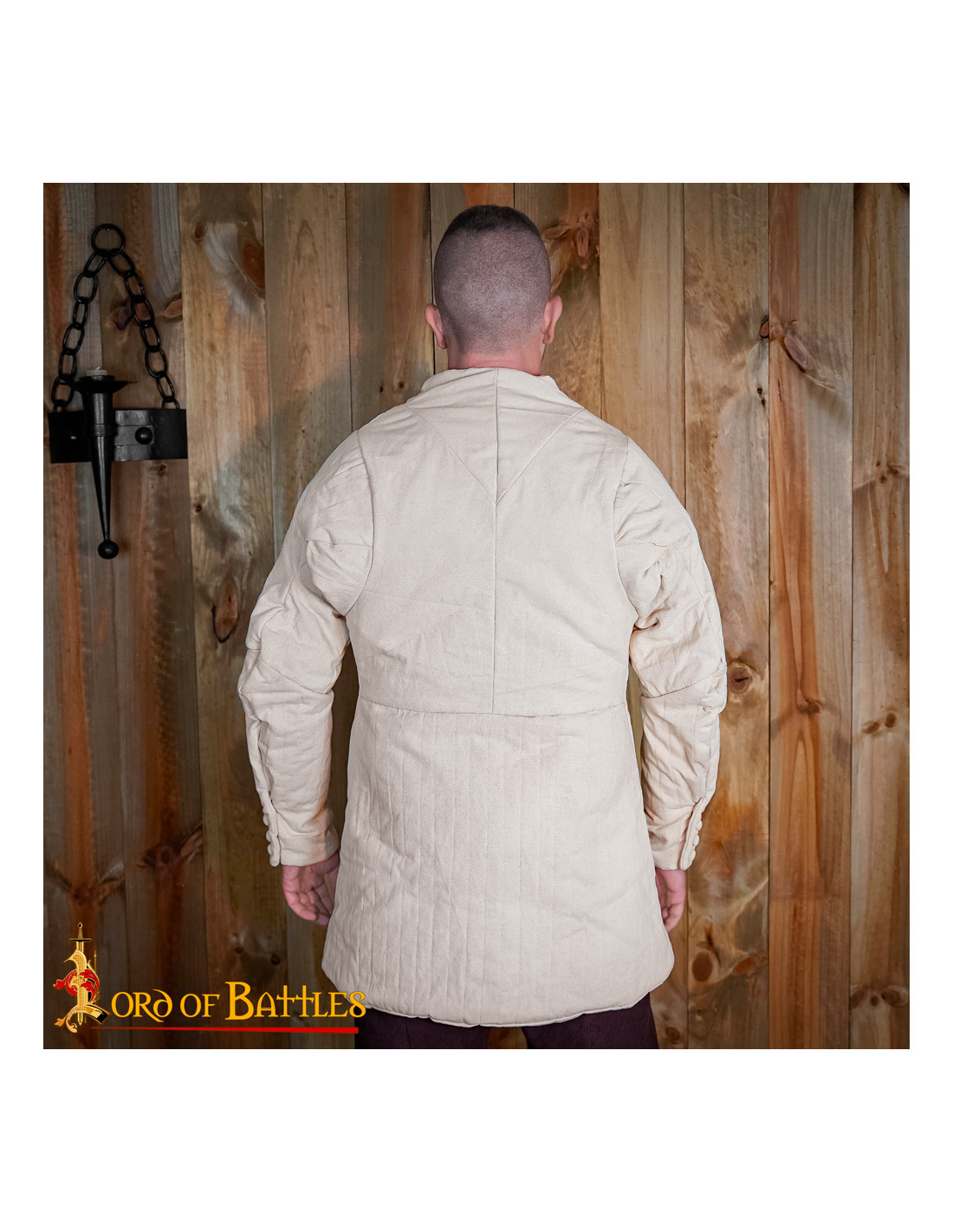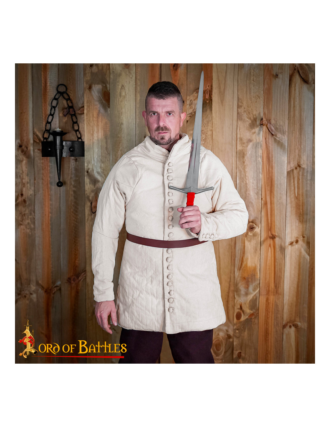 Suchen Sie eine Rüstung, die Authentizität, Komfort und einen beeindruckenden mittelalterlichen Stil vereint? Dieser gepolsterte Gambeson Typ 6 mit geknöpftem Vorderteil in Naturfarbe versetzt Sie direkt ins 14. Jahrhundert mit seinem Design, das von einem echten Helm inspiriert ist, der Charles de Blois gehörte. Handgefertigt aus außergewöhnlichen Materialien bieten seine doppelte Schicht aus strapazierfähigem Baumwollcanvas und einer dicken Polsterschicht echten und langlebigen Schutz – perfekt für leichte Infanteriesoldaten, Bogenschützen, Artilleristen oder Krieger, die sich auf dem Schlachtfeld agil bewegen möchten.