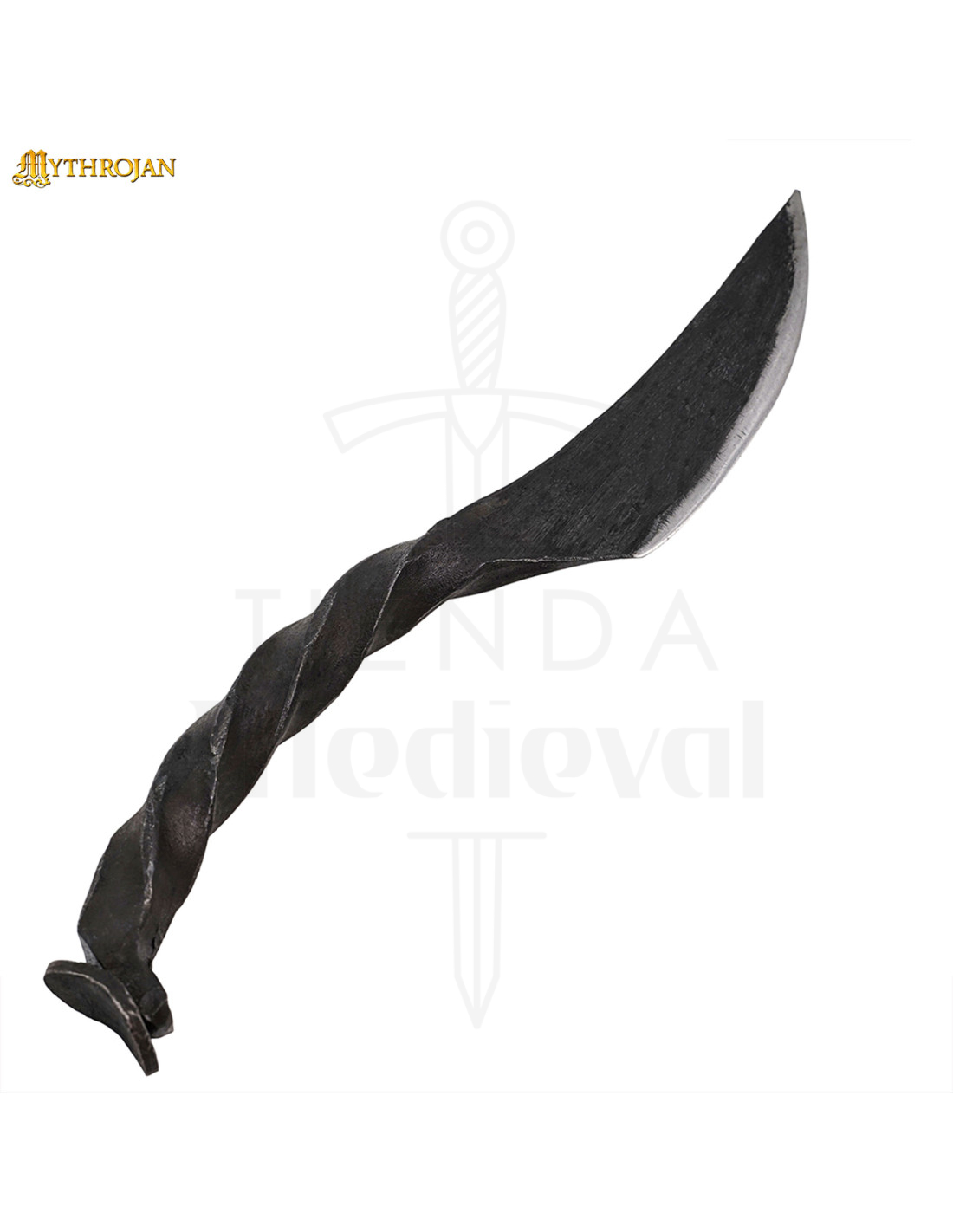 Der gedrehte Griff verleiht einen Hauch von Eleganz und Funktionalität und sorgt für einen sicheren und bequemen Halt. Begleitet von einer Lederscheide ist dieses Messer nicht nur praktisch, sondern auch ästhetisch ansprechend, mit einer rustikalen Oberfläche, die seine Authentizität unterstreicht.