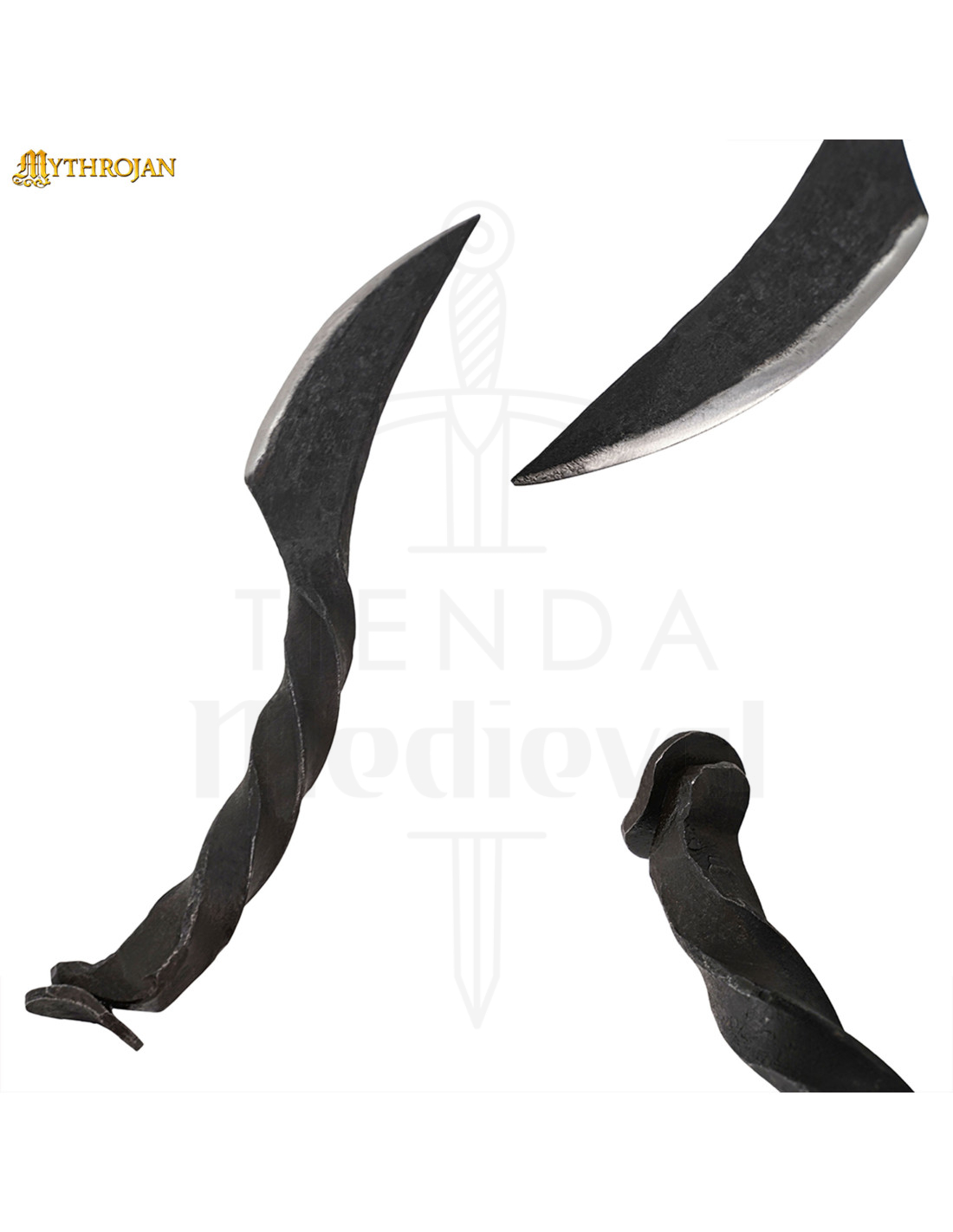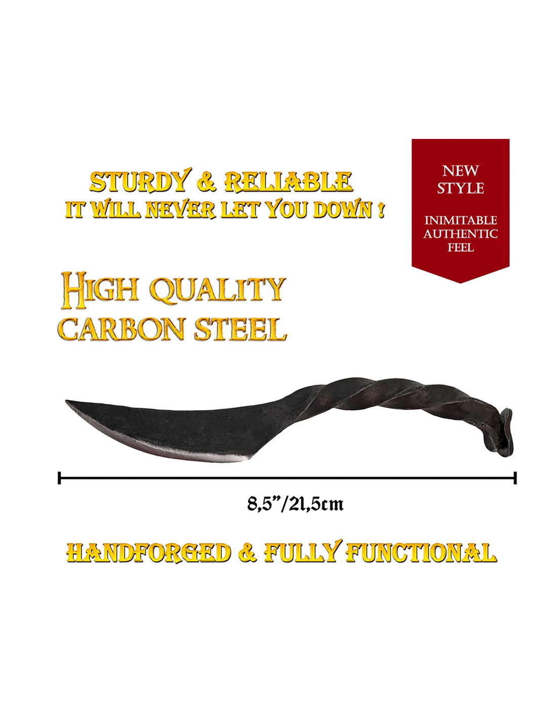 Dieses 21,5 cm lange mittelalterliche Messer ist ein wahres Meisterwerk traditioneller Schmiedekunst, entworfen für diejenigen, die Qualität und Geschichte schätzen. Hergestellt aus gehärtetem Kohlenstoffstahl nach jahrhundertealten Techniken, garantiert dieses Messer außergewöhnliche Haltbarkeit und Widerstandsfähigkeit, weit überlegen gegenüber den billigen Replikaten, die oft schnell brechen. Wenn Sie ein Werkzeug suchen, das der Zeit standhält, ist dieses Messer die perfekte Wahl.