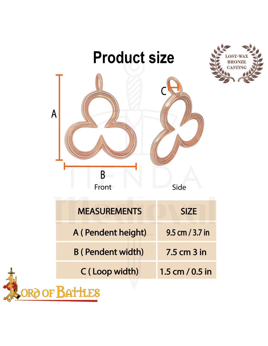 Gefertigt mit der traditionellen Wachsausschmelztechnik präsentiert der Anhänger eine solide Oberfläche und ein natürliches Finish, das historischen Charakter verleiht, ohne die notwendige Robustheit für den täglichen Gebrauch oder Live-Events zu vernachlässigen. Die erhabenen Linien folgen der Silhouette des Kleeblatts und erzeugen einen Tiefeneffekt, der das Licht einfängt und den goldbraunen Kupferton betont – ideal zum Kombinieren mit Tuniken, historischen Kleidungsstücken oder modernen Styles.