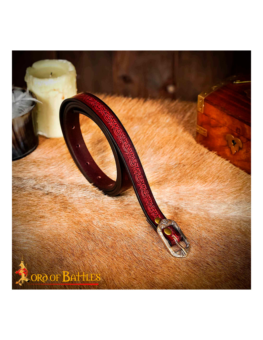 Gefertigt aus echtem Büffelleder, besticht dieser Gürtel nicht nur durch seine Schönheit, sondern auch durch seine Robustheit. Er bietet dir ein Stück, das deinen Stil begleitet, ohne Komfort oder Langlebigkeit zu verlieren. Das zarte Relief in Granat-Tönen verleiht eine elegante, mittelalterliche Note, die alle Blicke auf sich zieht und ein einfaches Accessoire zum Blickfang macht.