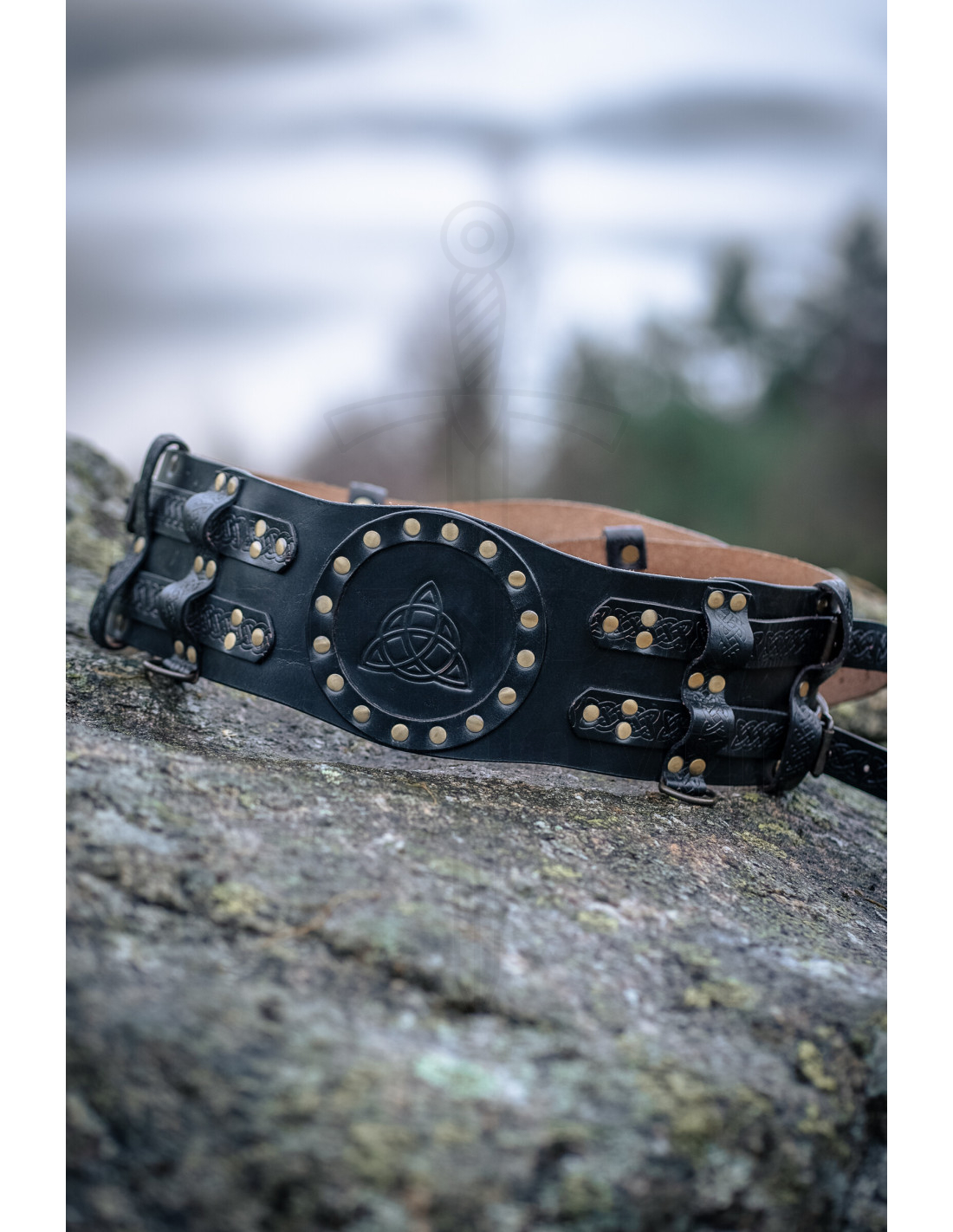 Bist du bereit, deinen kriegerischen Geist mit einem Hauch von Mystik zu tragen? Dieser keltische Leder-Gürtel Bedran verbindet dich mit der Urkraft und Stärke des Mittelalters und vereint robusten Stil mit kraftvoller Symbolik. Seine imposante Breite und das Muster aus Knoten und goldenen Nieten verleihen Charakter und handwerkliche Details. Im Zentrum hebt eine Gravur der Triskele, Symbol für Einheit und Harmonie, seinen spirituellen und uralten Charakter hervor. Die Metallringe ermöglichen das Verstellen und Aufhängen von Accessoires, was diesen Gürtel zu einem praktischen Begleiter für mittelalterliche Abenteuer oder Cosplay macht.