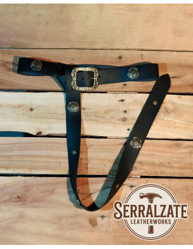 Die goldenen Nieten und die runden Applikationen mit keltischen Reliefs verleihen einen Hauch von Noblesse, während die kunstvoll gestaltete Schnalle, als Autorstück konzipiert, den Fokus des Ensembles bildet und jedes Outfit mit einem handwerklichen Touch aufwertet. Der Kontrast zwischen Metall und Leder erinnert an absichtlich geschmiedete Stücke, perfekt für diejenigen, die das Detail schätzen.