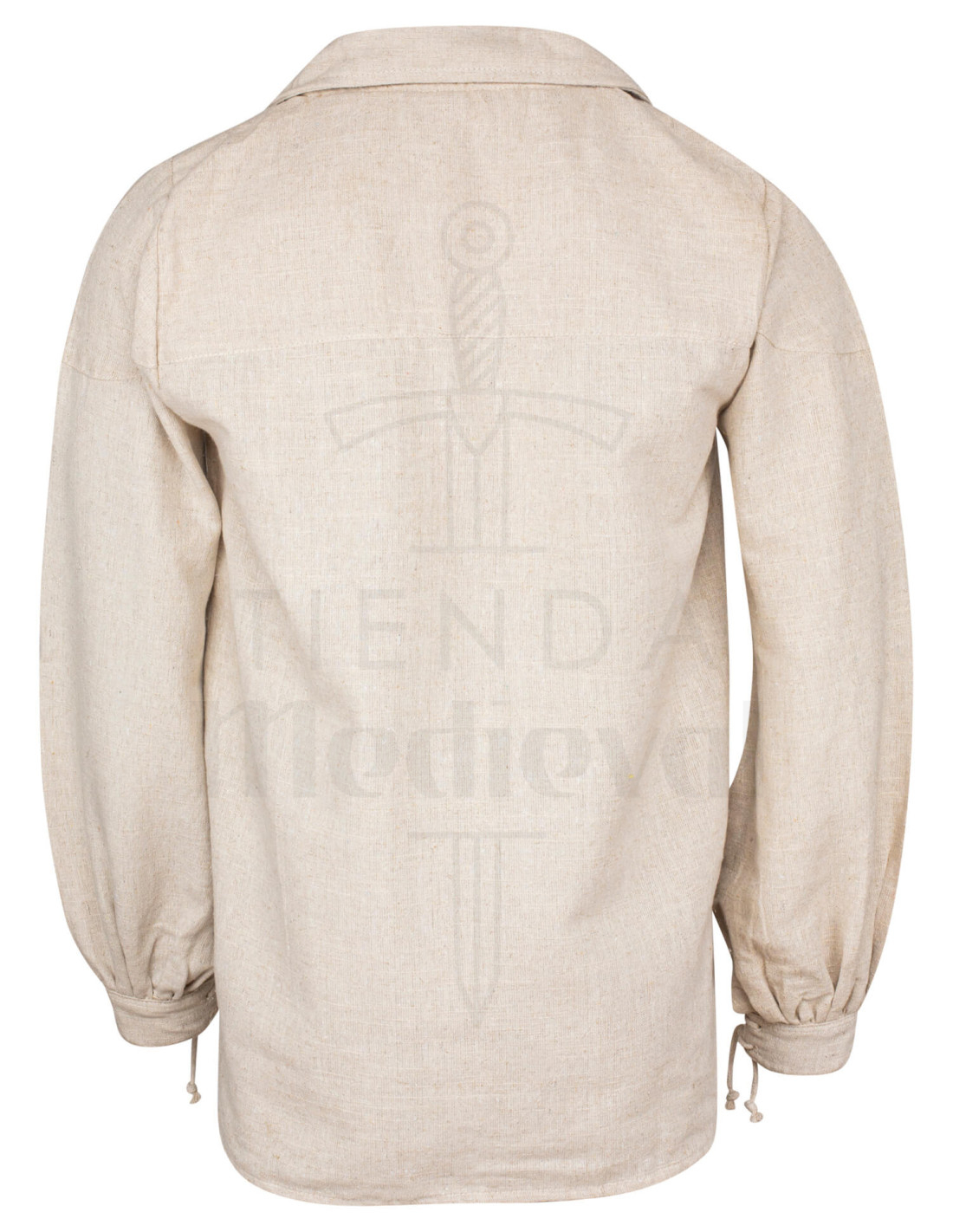 Der Reverskragen, den du mit den Schnürsenkeln anpassen kannst, zusammen mit den langen Ärmeln und den ebenfalls verstellbaren Manschetten, verleihen dem Hemd einen authentischen und funktionalen Touch. Die natürliche Textur des Leinens in Cremefarbe, mit einem Finish in Beige- oder Neuttonen, vermittelt eine klassische und vielseitige Ästhetik, die sich leicht mit verschiedenen Kleidungsstücken und Accessoires kombinieren lässt.