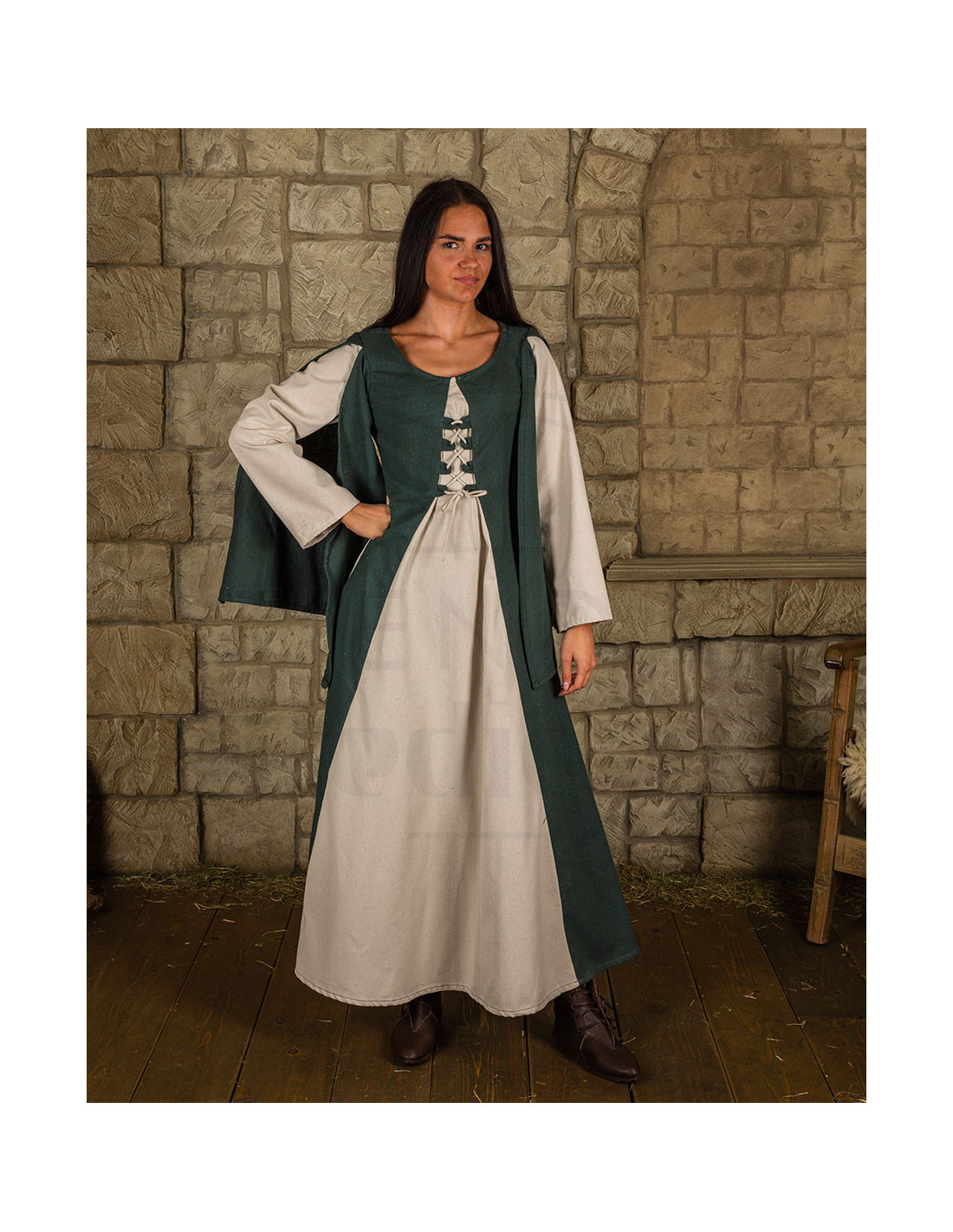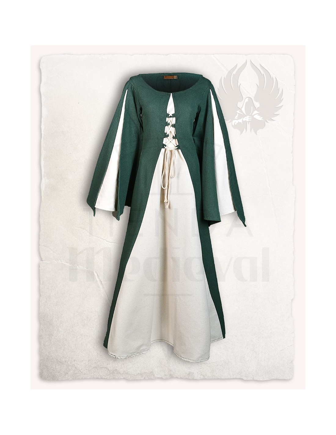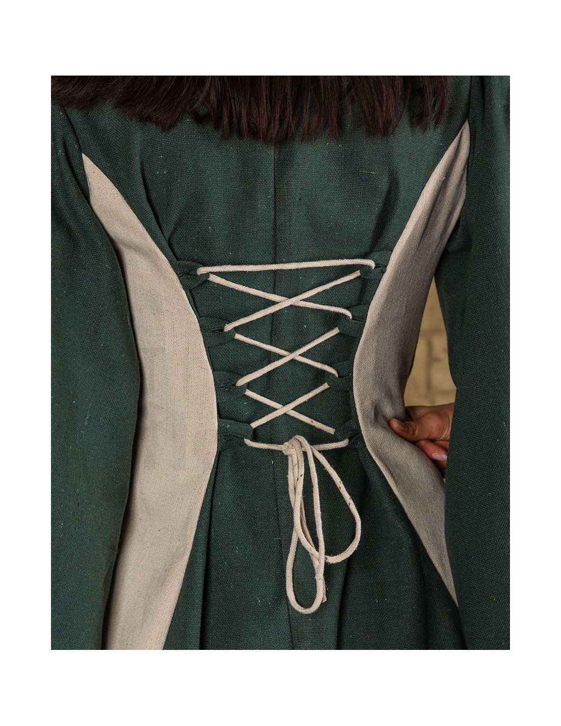 Seine "falschen" weiten und großzügigen Ärmel verleihen einen distinguierte und dramatische Note, die die Eleganz alter Gewänder nachahmt, aber mit einem zeitgenössischen Touch. Der fließende, leichte Rock bewegt sich anmutig und ermöglicht uneingeschränkte Bewegungsfreiheit. Die verstellbare Taille mit einem Kordelzug betont deine Silhouette und hebt deine Figur vorteilhaft hervor. Das gesamte Kleid ist aus **Canvas** gefertigt, einem strapazierfähigen und bequemen Material, das Langlebigkeit mit einem authentischen Look verbindet und das Gefühl mittelalterlicher Stoffe evoziert. Dieses Outfit ist perfekt für alle, die die Magie wieder aufleben lassen möchten, mit einem Kleid, das Fantasie und Raffinesse atmet.