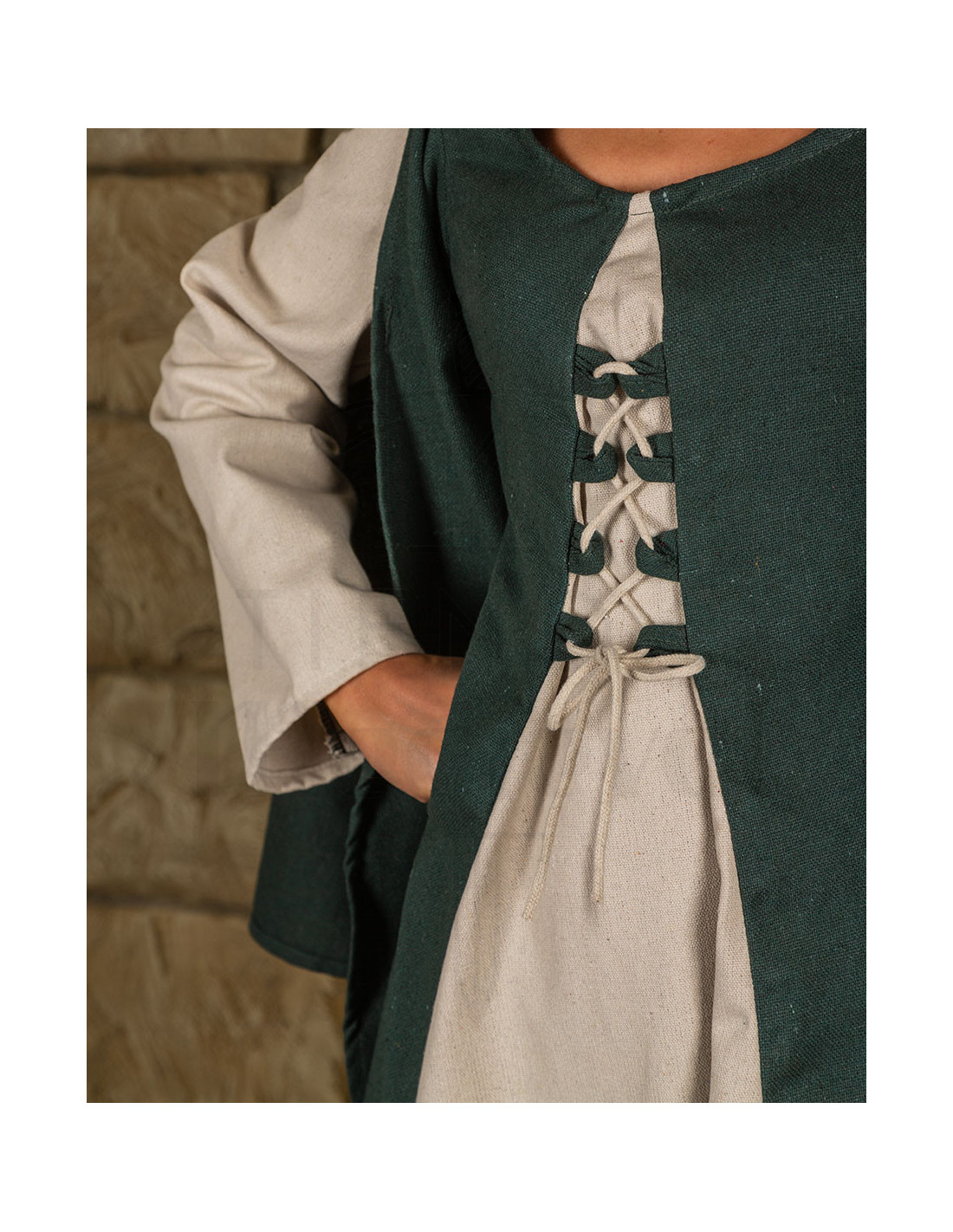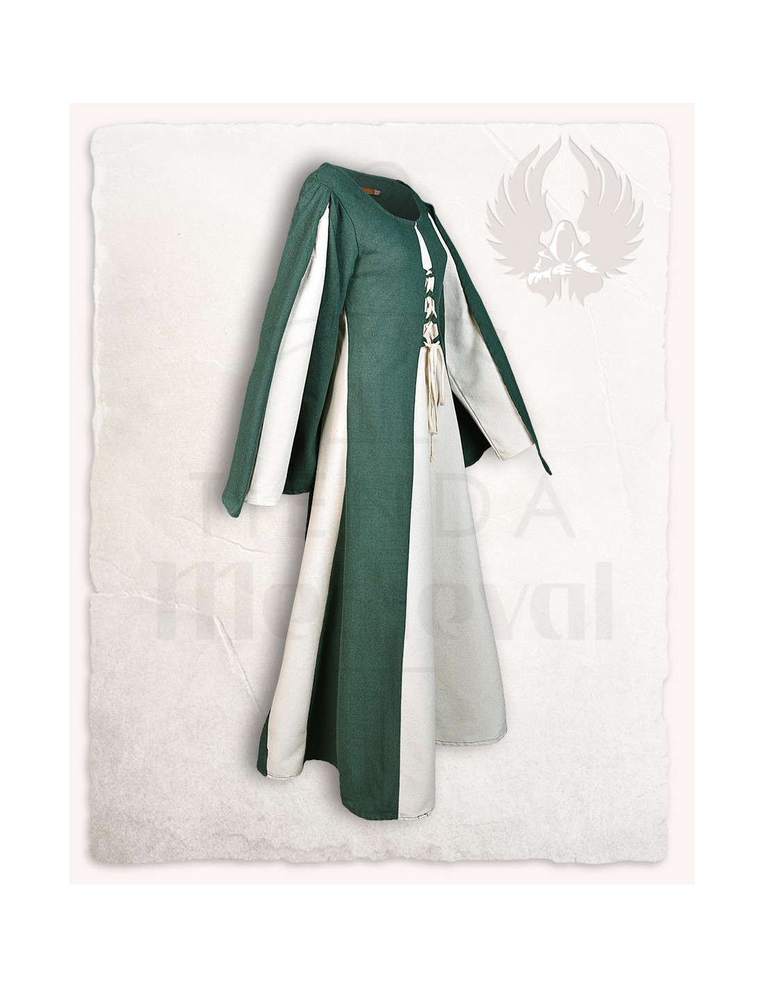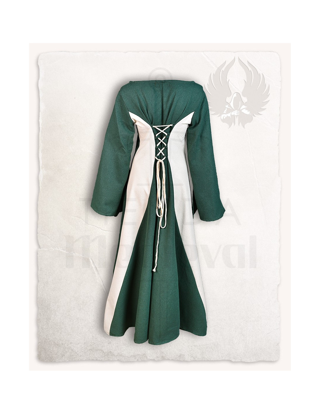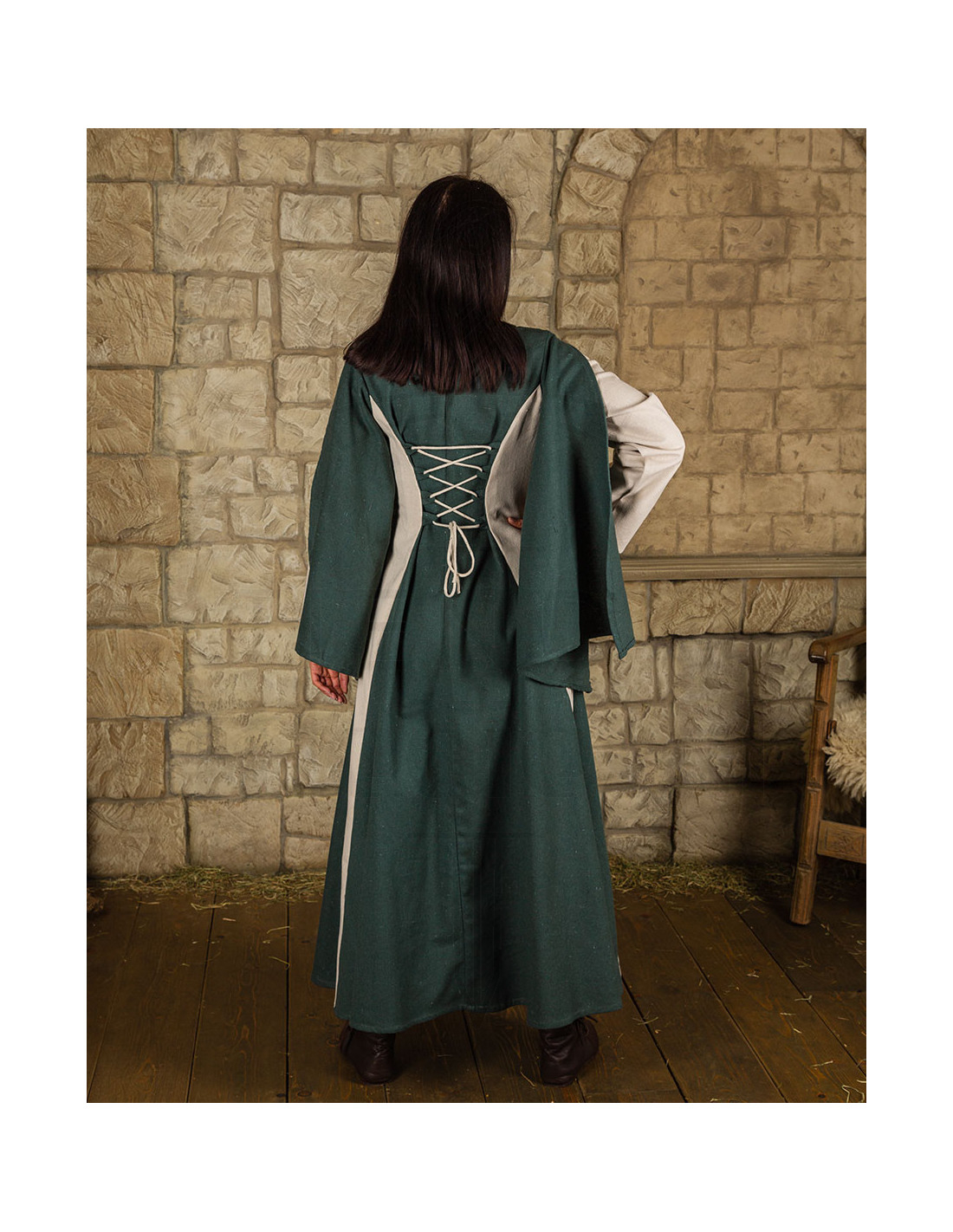 Seine "falschen" weiten und großzügigen Ärmel verleihen einen distinguierte und dramatische Note, die die Eleganz alter Gewänder nachahmt, aber mit einem zeitgenössischen Touch. Der fließende, leichte Rock bewegt sich anmutig und ermöglicht uneingeschränkte Bewegungsfreiheit. Die verstellbare Taille mit einem Kordelzug betont deine Silhouette und hebt deine Figur vorteilhaft hervor. Das gesamte Kleid ist aus **Canvas** gefertigt, einem strapazierfähigen und bequemen Material, das Langlebigkeit mit einem authentischen Look verbindet und das Gefühl mittelalterlicher Stoffe evoziert. Dieses Outfit ist perfekt für alle, die die Magie wieder aufleben lassen möchten, mit einem Kleid, das Fantasie und Raffinesse atmet.