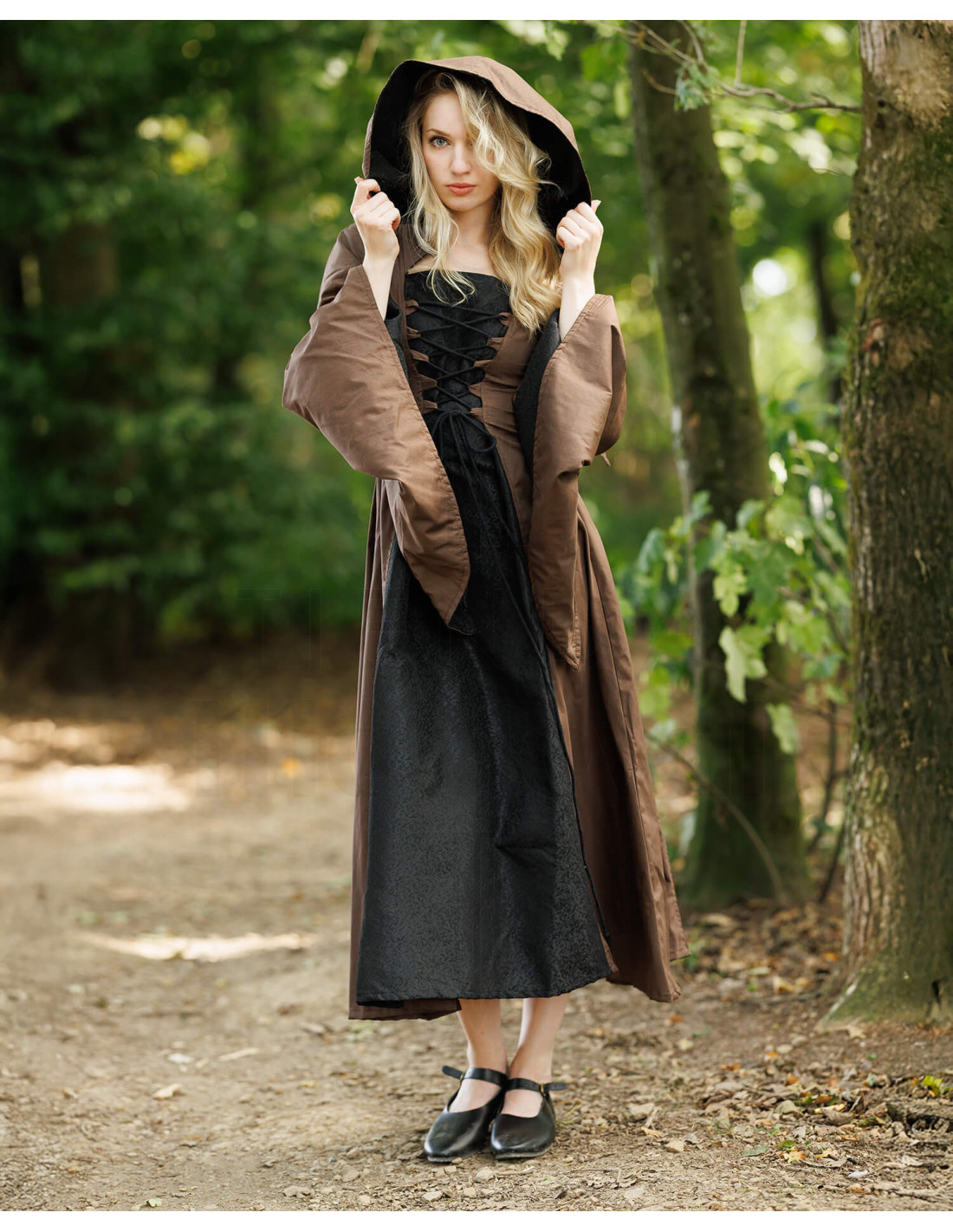 Perfekt für historische Veranstaltungen, Märkte und Momente, in denen Sie eleganter hervorstechen möchten, ist Ophelia auch für lange Spaziergänge angenehm zu tragen, dank des knöchellangen Schnitts, der das Gehen erleichtert, ohne einzuengen. Wenn Sie das mittelalterliche Kleid aus Baumwolle Modell Ophelia, schwarz-braun kaufen möchten, finden Sie ein Kleidungsstück, das historische Ästhetik mit modernem Komfort verbindet.