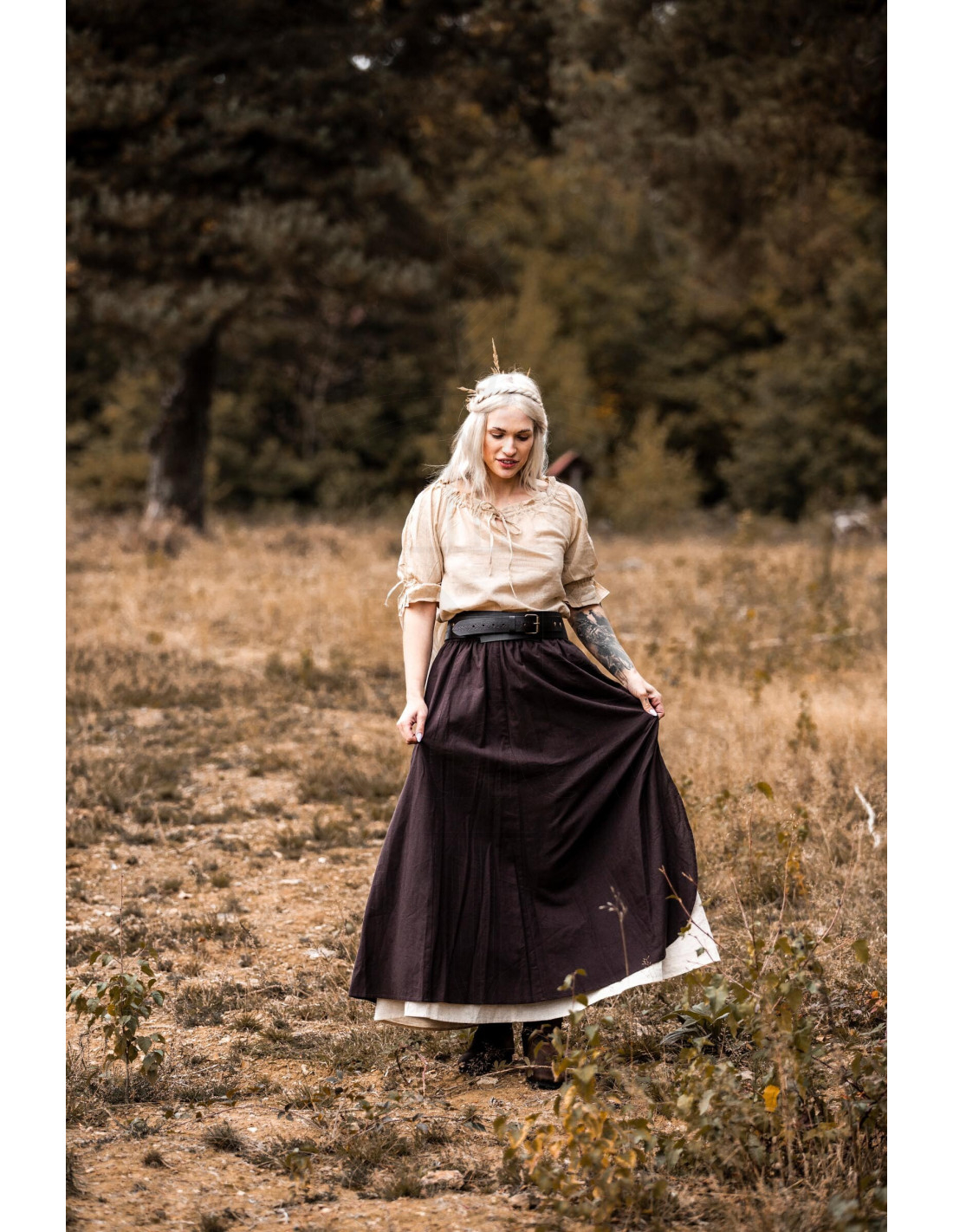 Der Mittelalterlicher Rock Modell Elise Braun-Natural ist für diejenigen gedacht, die eine Mischung aus klassischer Eleganz und echtem Komfort suchen. Das Design mit zwei Schichten nutzt den Kontrast zwischen Innen- und Außenansicht, um einen fließenden Fall zu schaffen, der deine Gesten begleitet und die Silhouette ohne Komplikationen betont. Der seitliche Knopfverschluss ermöglicht eine Anpassung des Volumens und des Falls an den gewünschten Look, von einer schlichteren bis zu einer theatralischeren Erscheinung.