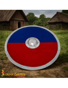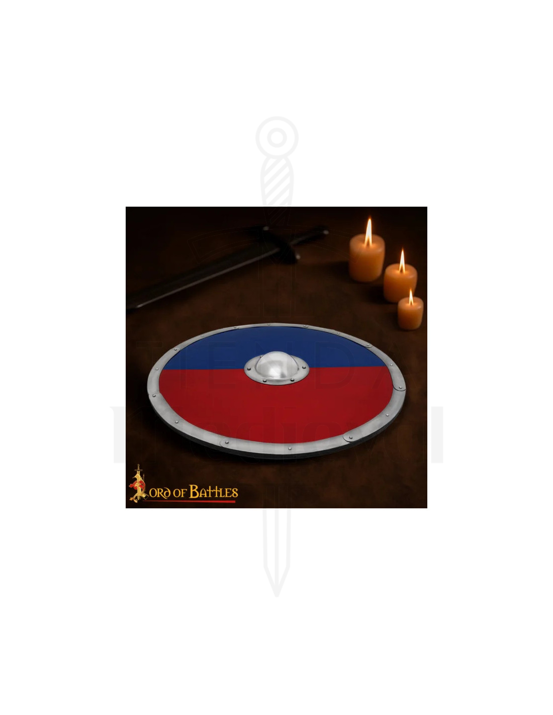 Die beeindruckende horizontale Teilung in Blau oben und Rot unten schafft einen perfekten visuellen Kontrast für Aufführungen, Nachstellungen oder Dekoration, während der genietete Metallrand ein Gefühl von Realismus verleiht, das dem kontinuierlichen Gebrauch standhält. Der mittlere Metallknopf, der mit Riegeln befestigt ist, verstärkt nicht nur die Ästhetik, sondern schützt auch den Griffbereich und hebt das authentische Aussehen von Kampfausrüstung hervor.