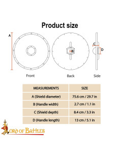 Die Konstruktion mit metallischen Versteifungen im Zentrum und am Umfang garantiert die Haltbarkeit bei Nutzung in Szenen, Übungen und Ausstellungen und bewahrt das zweifarbige Erscheinungsbild dank des Randes, der die Verbindung zwischen den Materialien schützt. Es ist ein Stück, das für diejenigen gedacht ist, die visuelle Wirkung und Zuverlässigkeit in rekreativen und historischen Umgebungen suchen.