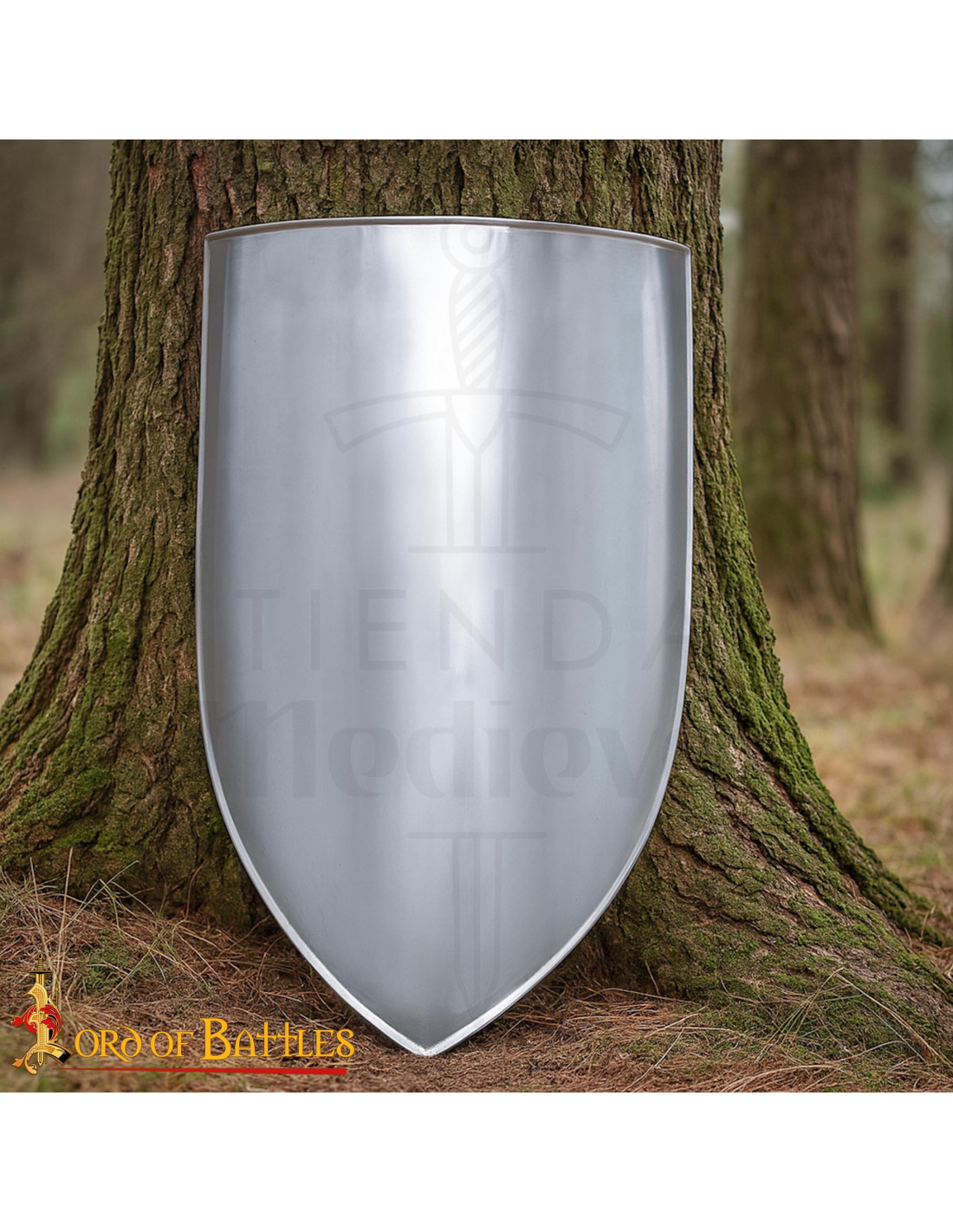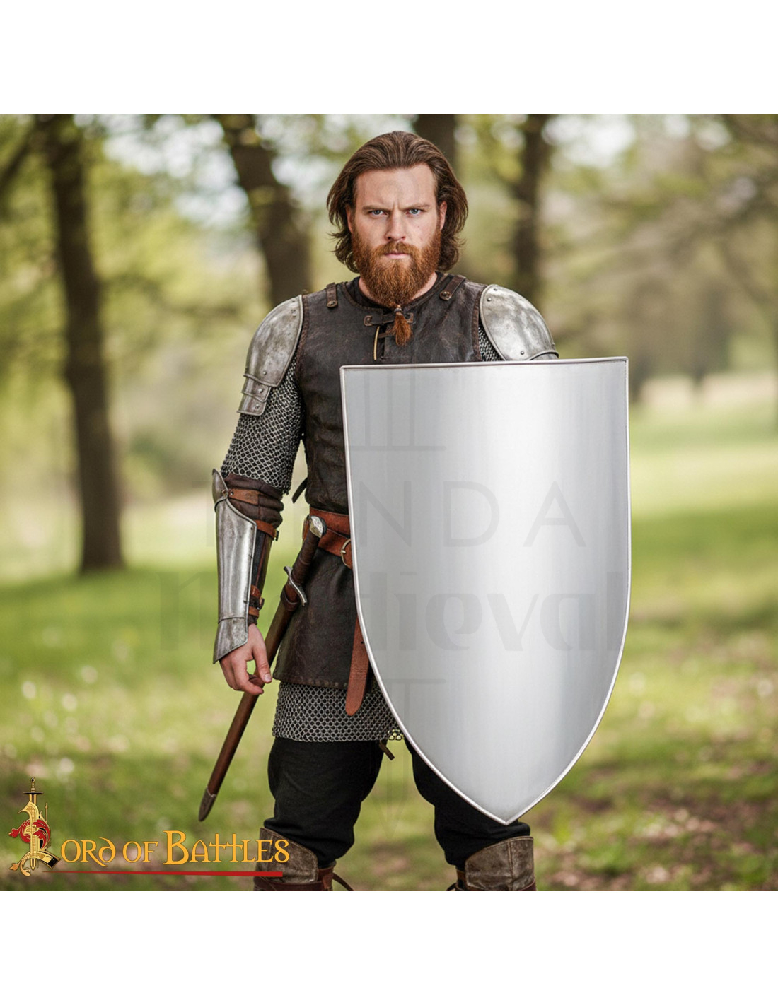Dieser personalisierbare Mittelalterlicher Stahlschild 18G vereint eine imposante Präsenz mit einem agilen Griff, gedacht für diejenigen, die ein funktionales Objekt in ein einzigartiges Kunstwerk verwandeln wollen. Seine klassische, spitze Form und die polierte Oberfläche reflektieren das Licht elegant und bieten eine glatte und edle Leinwand, die jedes Design ohne Ablenkungen hervorhebt.