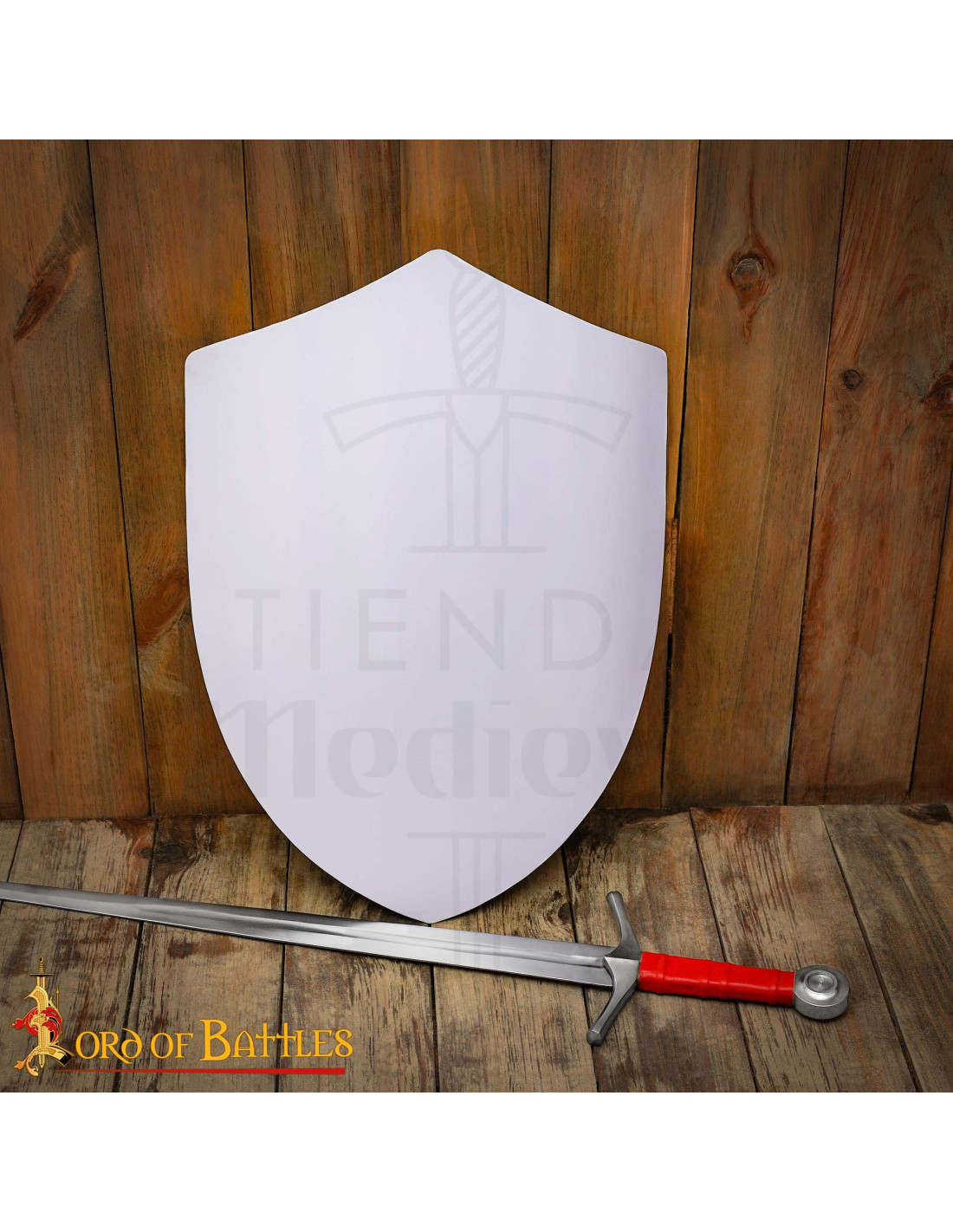 Die polierte und klare Oberfläche, wie im Bild zu sehen, bietet eine perfekte Leinwand, um das Schild in Ihr eigenes Banner zu verwandeln. Sie können es mit einem Templerkreuz, einem persönlichen Wappen oder in seiner metallischen Ausführung für eine schlichte und elegante Erscheinung dekorieren.