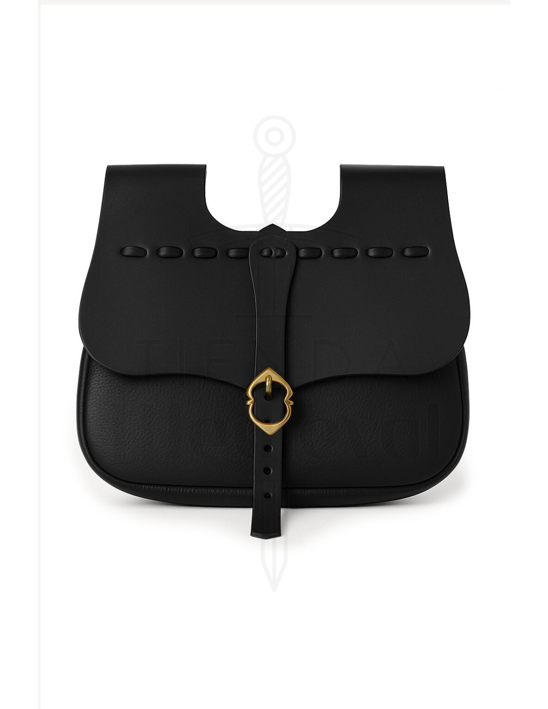 Mit einem Design, das von den Taschen inspiriert ist, die im Mittelalter verwendet wurden, spiegelt diese Bauchtasche nicht nur einen historischen Charakter wider, sondern bietet auch die Praktikabilität, sich dank ihrer zwei Schlaufen bequem an Gürtel bis zu 5 cm Breite zu befestigen. Das schwarze Leder-Finish, weich und elegant, sorgt für Langlebigkeit und einen anspruchsvollen Look bei jedem Gebrauch. Die geschwungene Klappe mit Nähten und die Schnalle aus goldfarbenem Metall verleihen einen markanten Akzent, der Authentizität und modernen Stil vereint.