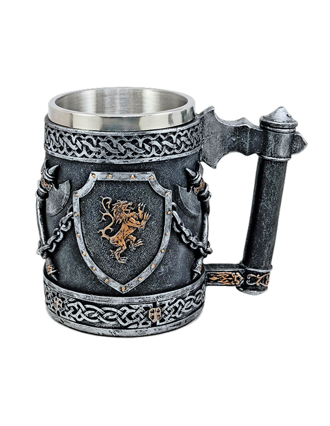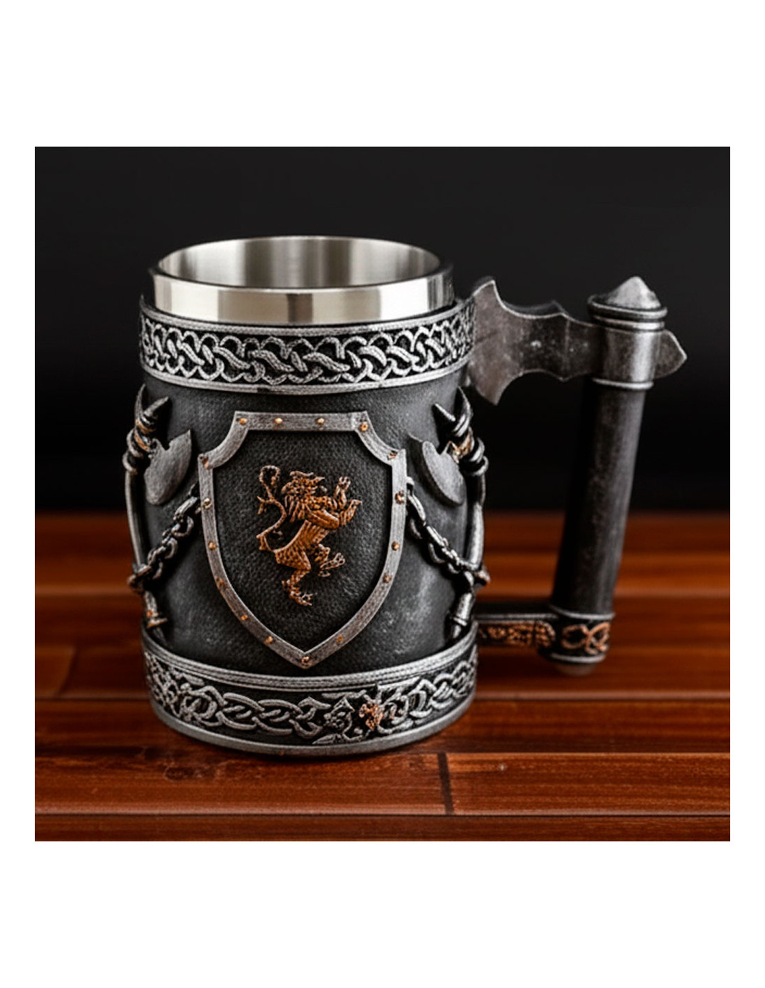 Ideal für Liebhaber von Geschichte und Dekoration, die ein einzigartiges und auffälliges Produkt suchen: Diese mittelalterliche ornamentale Resin-Tasse mit Äxten und Schilden garantiert ein unvergessliches visuelles und funktionales Erlebnis. Kaufen Sie jetzt und verleihen Sie Ihren Treffen oder Sammlungen einen epischen Touch.