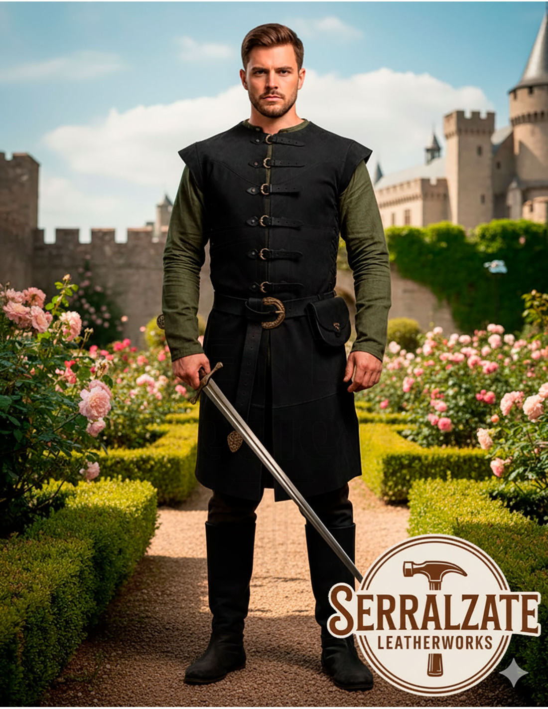Jedes Detail, von sichtbaren Nähten bis hin zu den strukturierten Panels am unteren Rand, ist darauf ausgelegt, Langlebigkeit und eine elegante Passform zu bieten. Wie alle Produkte von Serralzate LeatherWorks besticht auch die Tunika Baldomero durch ihr markantes Design und ihre Liebe zum Detail – ein unverzichtbares Kleidungsstück für jeden Liebhaber mittelalterlicher Ästhetik.