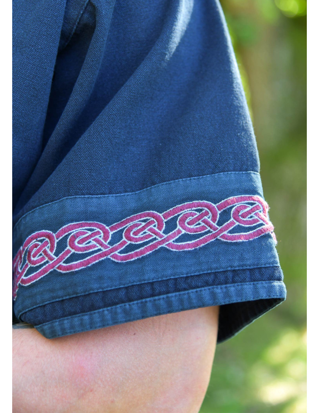Der V-förmige Ausschnitt mit Öffnung, verziert mit Flechtmustern in Rot- und Dunkelgrautönen, verleiht einen eleganten Touch, ohne die kriegerische Essenz zu verlieren. Das handwerkliche Detail, wie die Reparaturnähte am Kragen und Saum, spiegelt ihre Widerstandsfähigkeit wider. Die kurzen, weiten Ärmel, verziert mit keltisch inspirierten Flechtmustern, bieten volle Bewegungsfreiheit und sind ideal für Reenactments, LARP oder mittelalterliche Märkte.