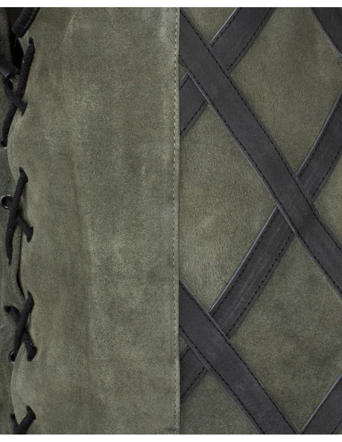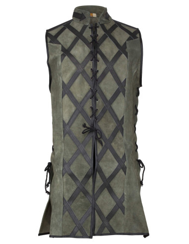 Bereite dich darauf vor, jede Bühne mit einem Hauch mittelalterlichen Stils zu erobern, der nicht unbemerkt bleibt. Diese grüne Cahir-Weste, gefertigt aus hochwertigem Wildleder, verbindet die Rustikalität des Leders mit einem charaktervollen Design, ideal für Abenteurer, Söldner oder Monsterjäger, die mit einem robusten und detailreichen Kleidungsstück hervorstechen möchten.