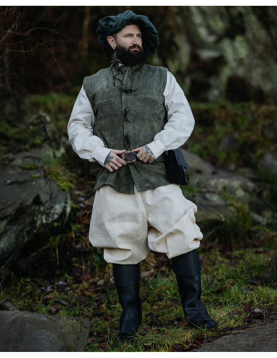 Suchen Sie nach einer authentischen und langlebigen Ergänzung für Ihre mittelalterlichen Kostüme oder Outfits? Dieses Wildleder-Westenmodell Laertes in lebendigem Grün ist die perfekte Wahl. Mit einem schlichten und funktionalen Design verfügt es über einen hohen Kragen, der Sie vor Wind schützt, und einen Verschluss mit fünf robusten Lederriegeln, der eine bequeme und sichere Passform gewährleistet. Sein minimalistischer Schnitt macht es ideal, um es als Zwischenschicht zu kombinieren, zum Beispiel über einer Tunika und unter einem Mantel, und verleiht Ihrem Look einen authentischen und praktischen Stil für Outdoor-Abenteuer.