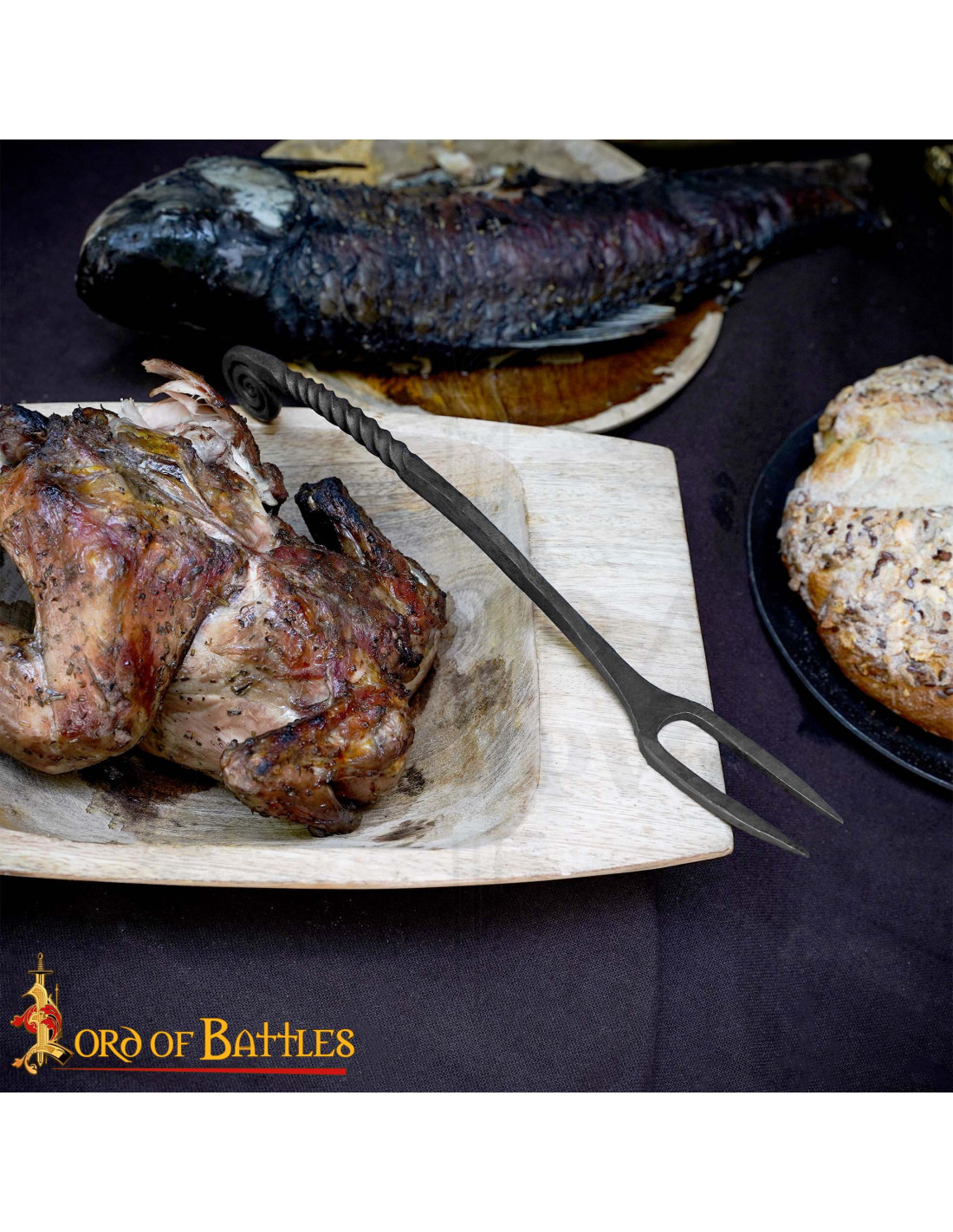 Inspiriert von mittelalterlichen Utensilien aus dem 8. bis 11. Jahrhundert spiegelt diese Gabel die Qualität und Langlebigkeit handwerklich geschmiedeter Gegenstände wider. Jedes Stück trägt einzigartige Schmiedemarken, die Exklusivität und authentischen Charakter garantieren. Das aufgerollte Ende verleiht nicht nur einen dekorativen Akzent, sondern dient auch als Haken zum Aufhängen, was die Lagerung und den Zugriff in Ihrem Lager oder rustikalen Küche erleichtert.