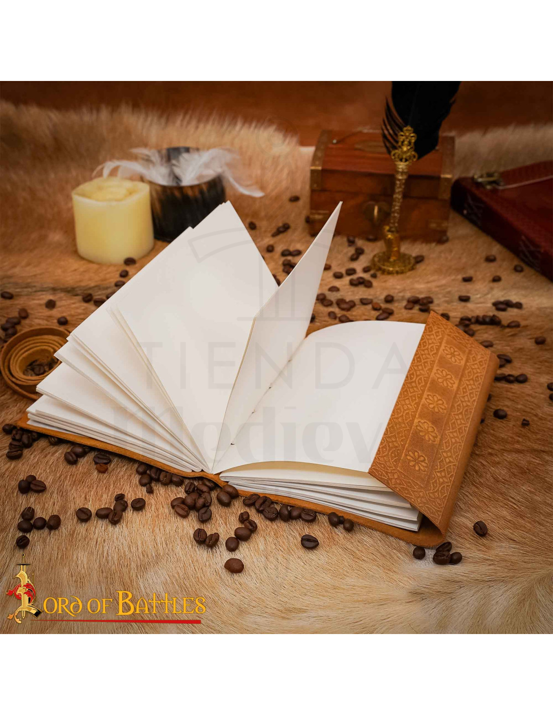 Dieses Tagebuch mit mittelalterlichem Lederdeckel, Fantasy-Charakter Design, ist für diejenigen gedacht, die mehr als nur Blätter suchen: Es bietet ein taktiles und visuelles Erlebnis, das Ihre Kreativität begleitet. Der harte Einband in hellem Braunton mit einem Relief, das einen stilisierten Vogel zeigt, und einem Rahmen mit geometrischen und floralen Motiven, macht jede Seite zu einer sorgfältig gestalteten Präsentation – ideal für diejenigen, die Wert auf Details und handwerklichen Charakter legen.