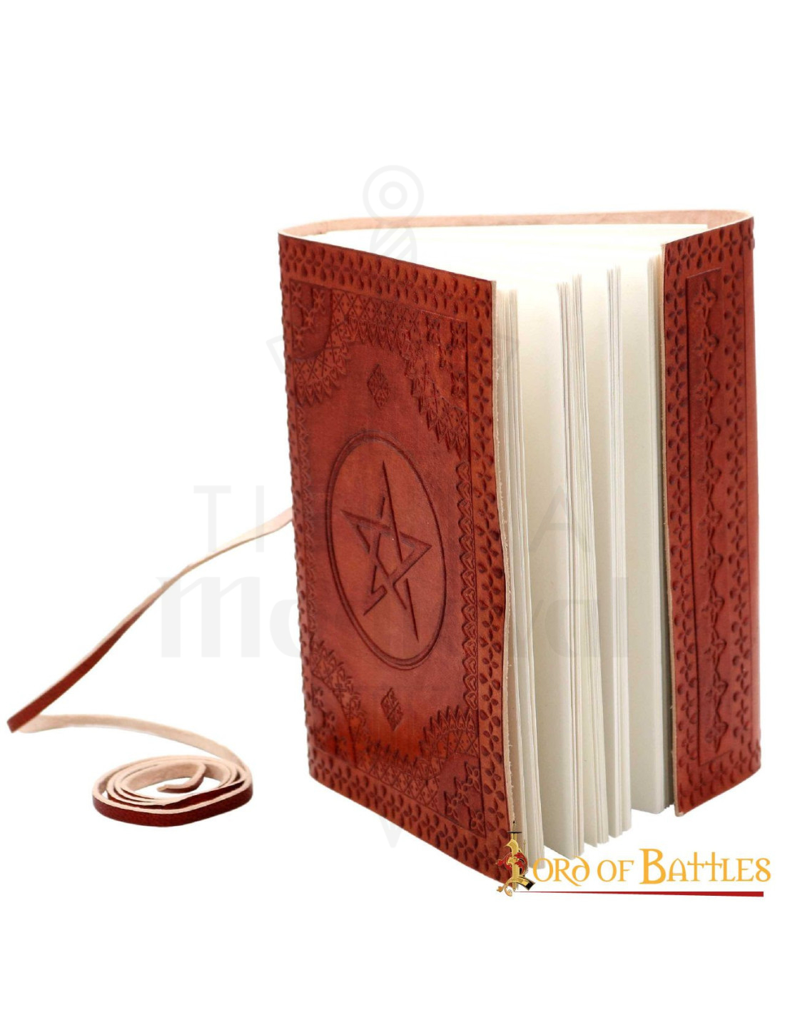 Der Deckel zeigt ein detailliertes Relief mit geometrischen Mustern und einem zentralen fünfzackigen Symbol innerhalb eines Kreises, was das Notizbuch zu einem visuell kraftvollen Stück macht. Dieses Siegel ist nicht nur Dekoration, sondern auch ein Emblem, das mit der Figur des Questers verbindet – dem Reisenden, der Leuchttürme, Riffe und Erinnerungen dokumentiert. Es macht das Tagebuch zu einem symbolischen und praktischen Begleiter auf jeder Route.