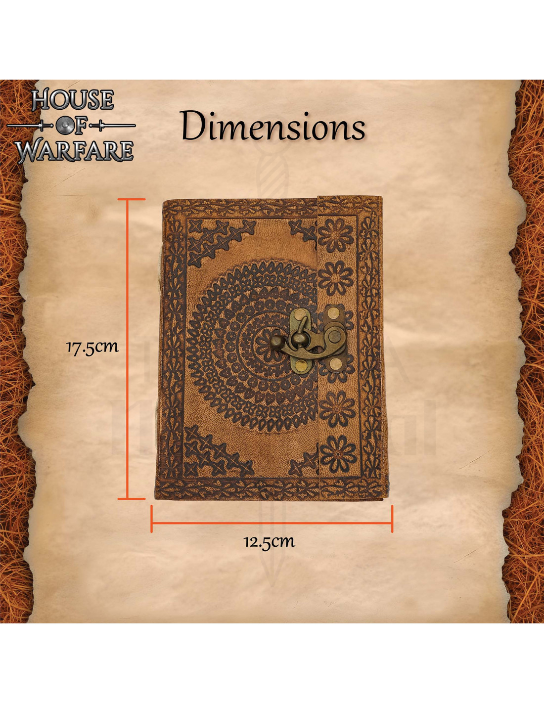 Das mittelalterliche Tagebuch mit Lederumschlag und floral geprägt Design fängt die Essenz Handwerkskunst ein, um Ihre Ideen elegant zu begleiten. Sein hellbrauner Einband, akzentuiert mit dunkelbraunen Motiven, bietet ein warmes und widerstandsfähiges Finish, das schützt, was Sie notieren, während das florale und geometrische Relief, mit einem zentralen Kreis-Motiv und Bordüren an den Rändern, das Notizbuch in ein dekoratives Stück verwandelt, das auf Ihrem Schreibtisch zur Schau gestellt oder in der Hand getragen werden kann.